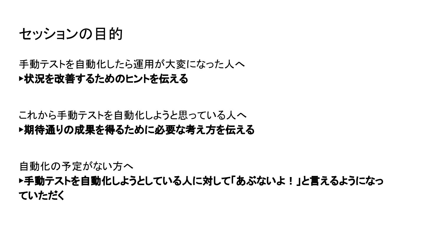 セッションの目的 手動テストを自動化したら運用が大変になった人へ ▶状況を改善するためのヒントを伝える これから手動テストを自動化しようと思っている人へ ▶期待通りの成果を得るために必要な考え方を伝える 自動化の予定がない方へ