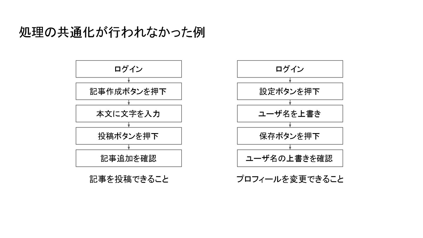 処理の共通化が行われなかった例 プロフィールを変更できること 記事を投稿できること ログイン 記事作成ボタンを押下 本文に文字を入力 投稿ボタンを押下 記事追加を確認 ログイン 設定ボタンを押下