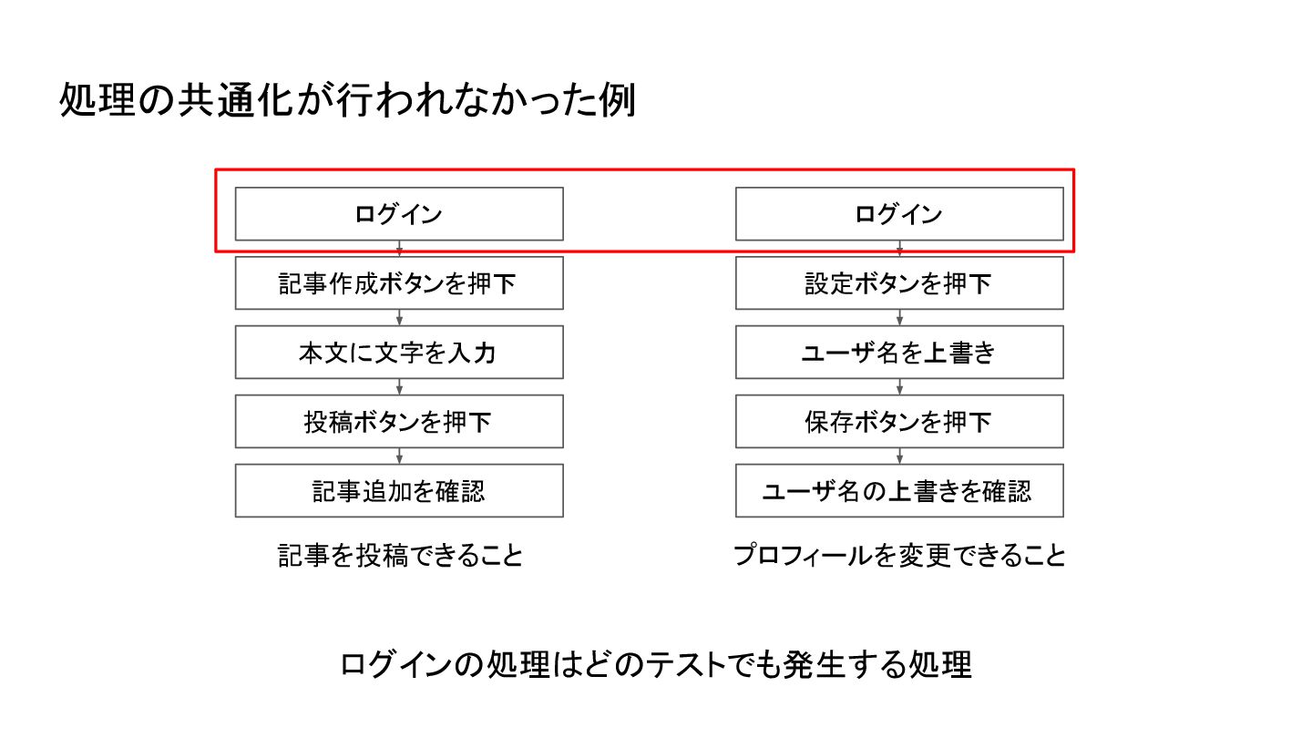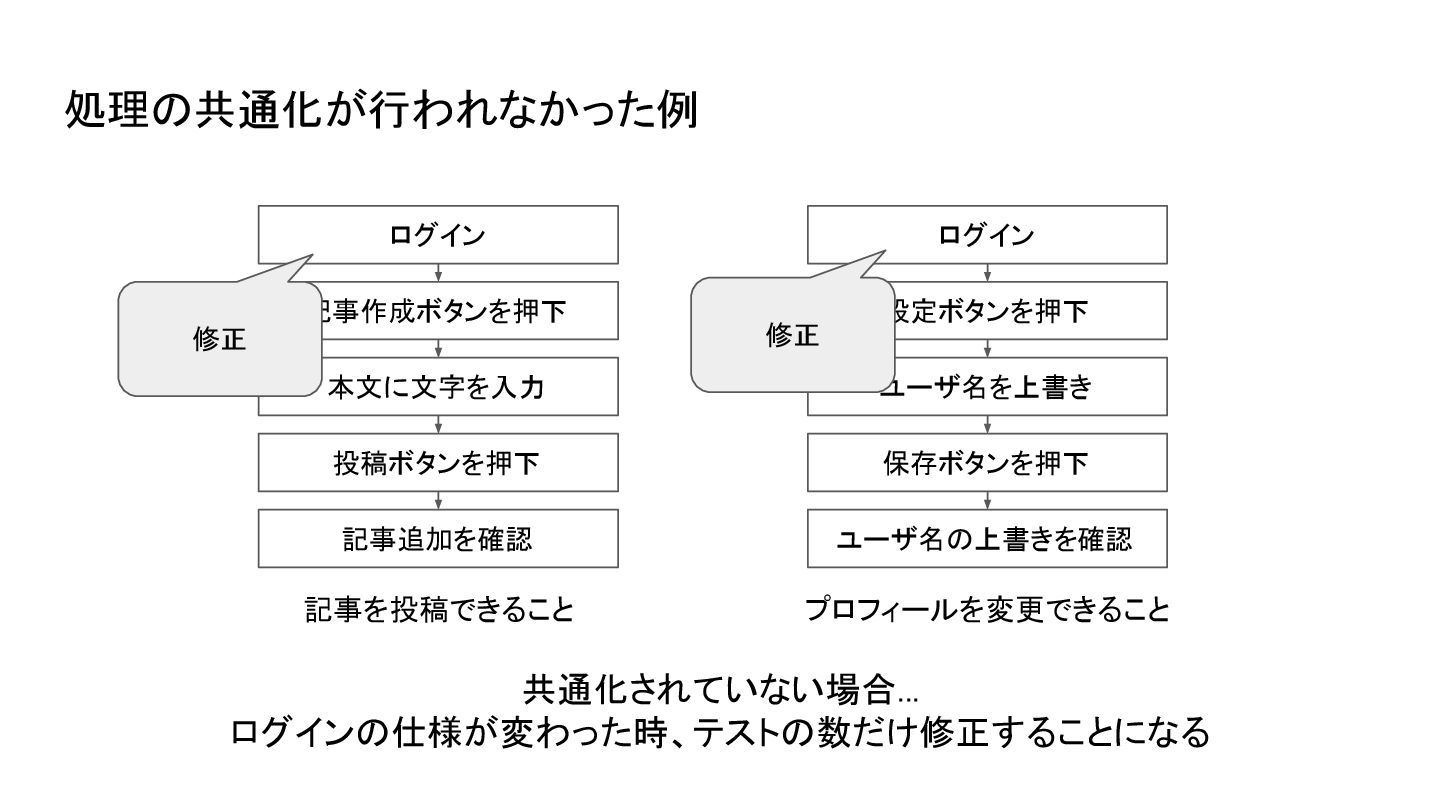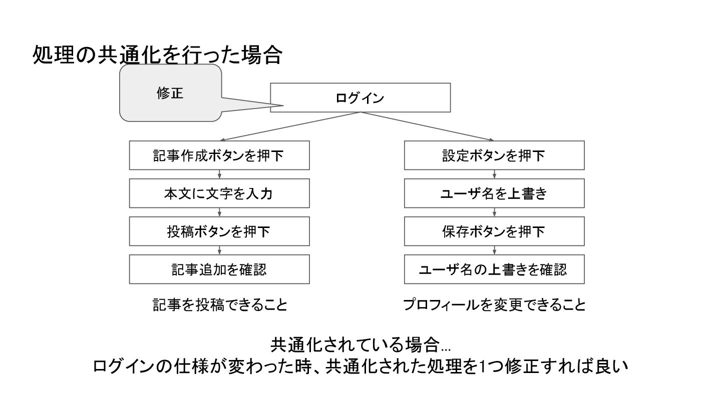 保存ボタンを押下 ユーザ名の上書きを確認 共通化されていない場合... ログインの仕様が変わった時、テストの数だけ修正することになる 修正 修正 処理の共通化が行われなかった例