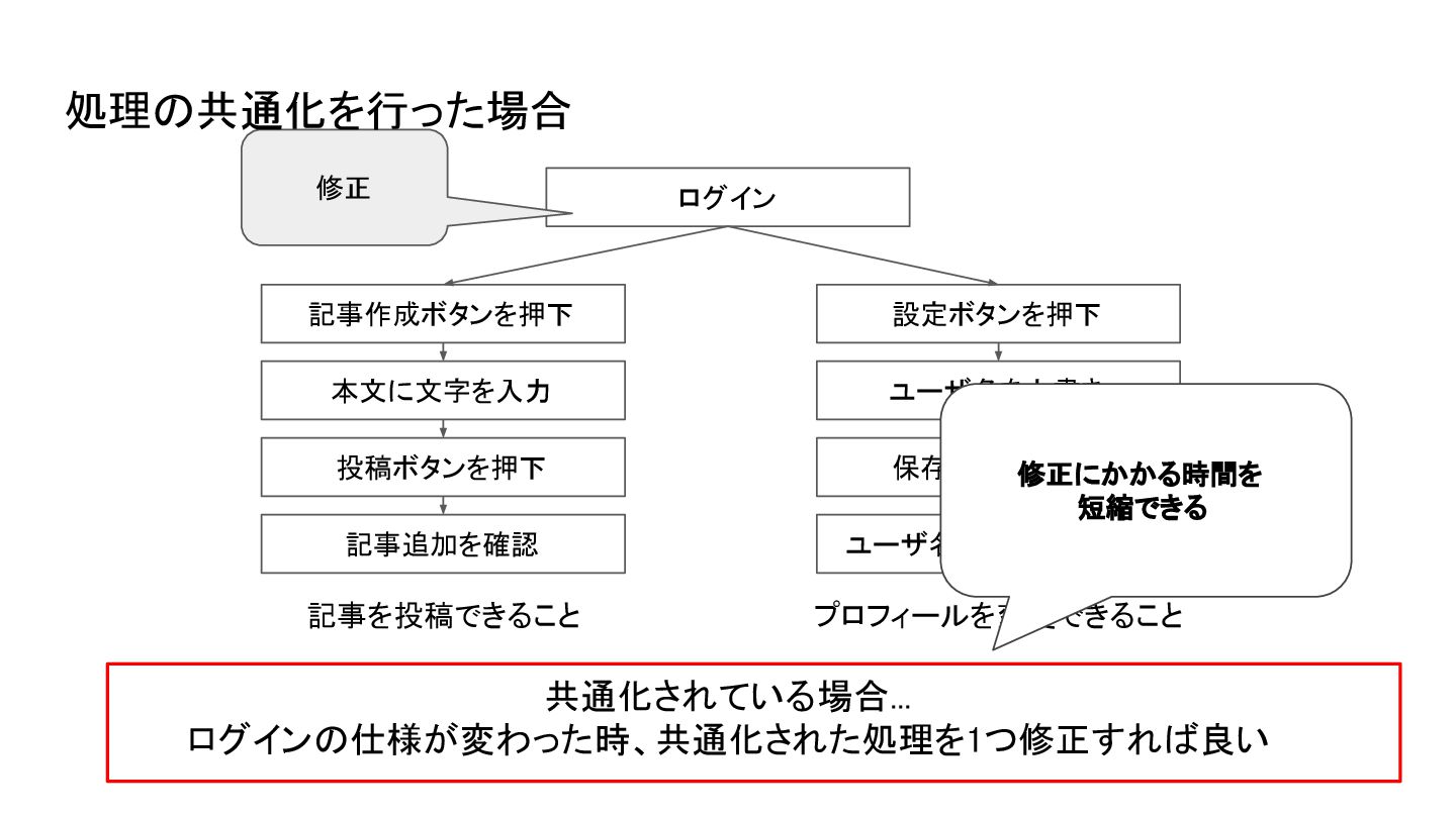 ユーザ名の上書きを確認 共通化されている場合... ログインの仕様が変わった時、共通化された処理を1つ修正すれば良い 修正 修正にかかる時間を 短縮できる 処理の共通化を行った場合