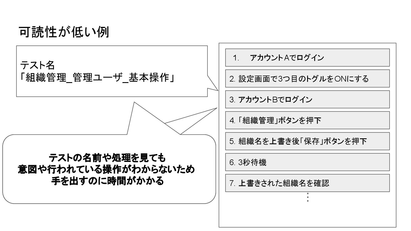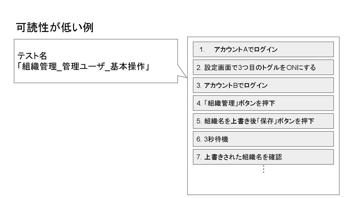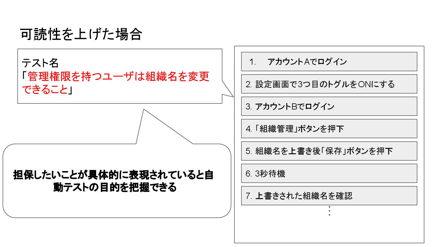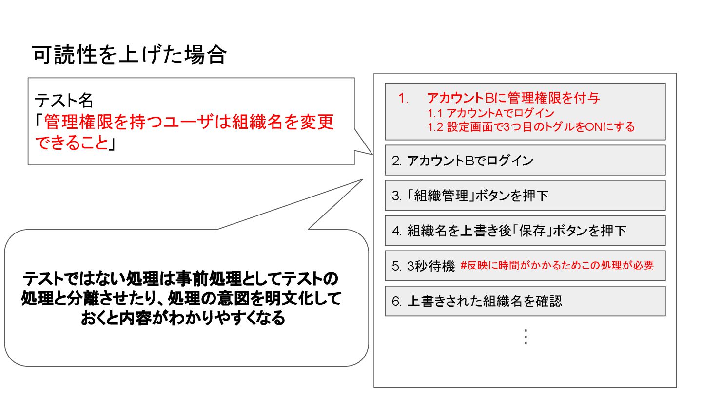 4. 組織名を上書き後「保存」ボタンを押下 6. 上書きされた組織名を確認 ・・・ テストではない処理は事前処理としてテストの 処理と分離させたり、処理の意図を明文化して おくと内容がわかりやすくなる 5. 3秒待機 #反映に時間がかかるためこの処理が必要 テスト名 「管理権限を持つユーザは組織名を変更 できること」 可読性を上げた場合
