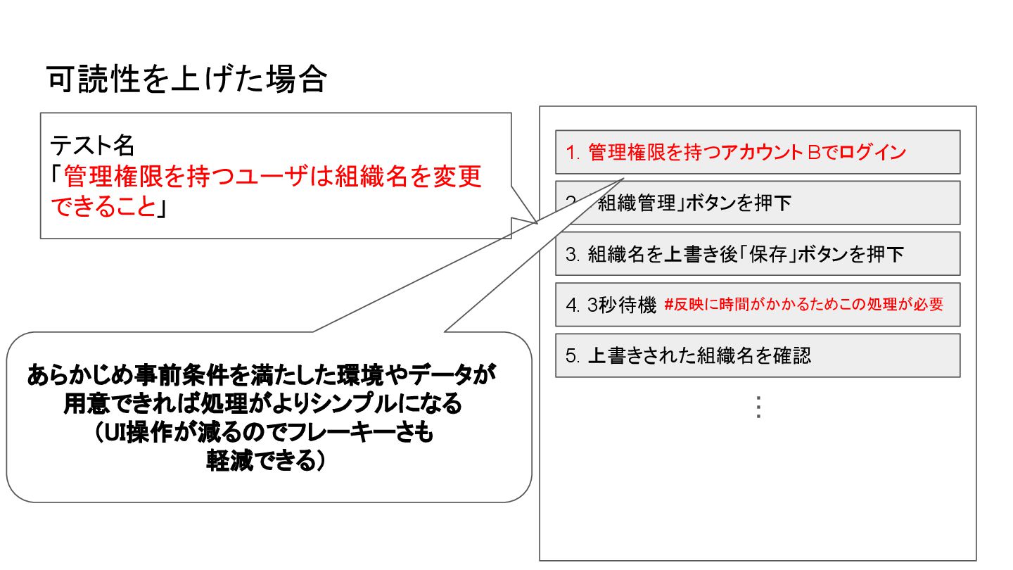 あらかじめ事前条件を満たした環境やデータが 用意できれば処理がよりシンプルになる (UI操作が減るのでフレーキーさも 軽減できる) 4. 3秒待機 #反映に時間がかかるためこの処理が必要 テスト名 「管理権限を持つユーザは組織名を変更 できること」 可読性を上げた場合