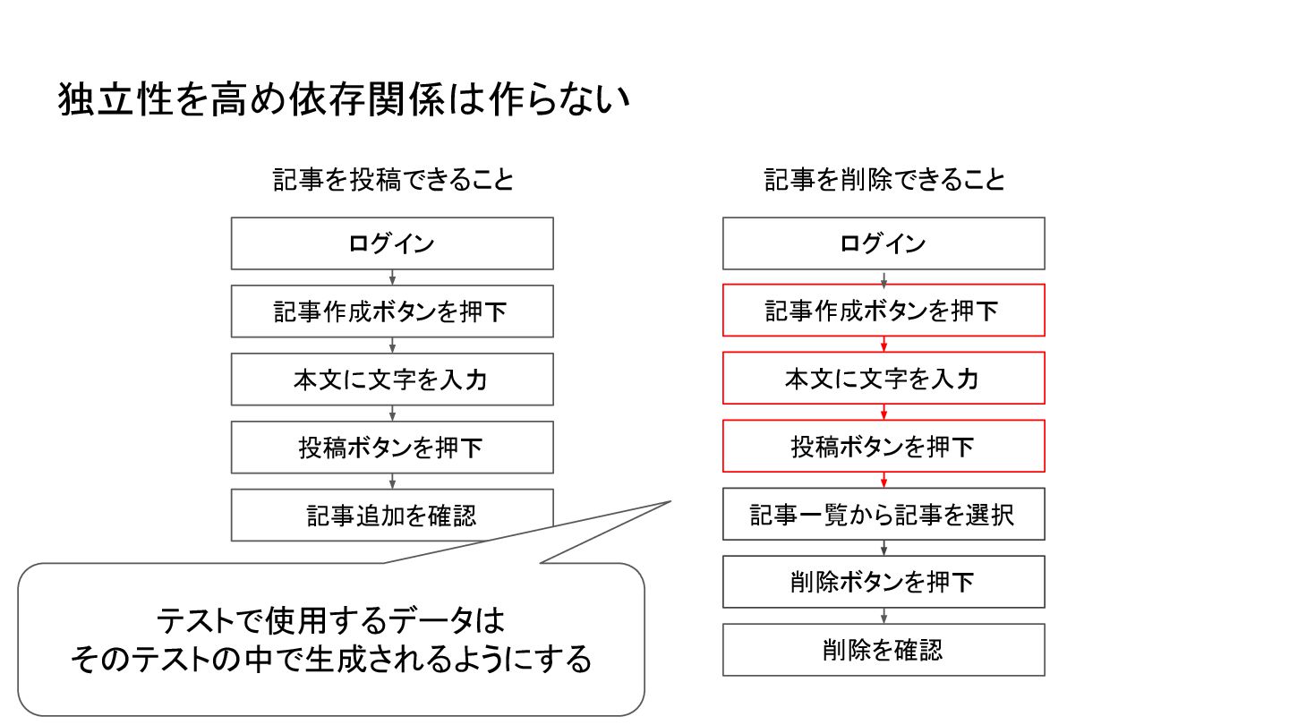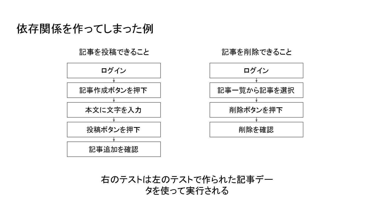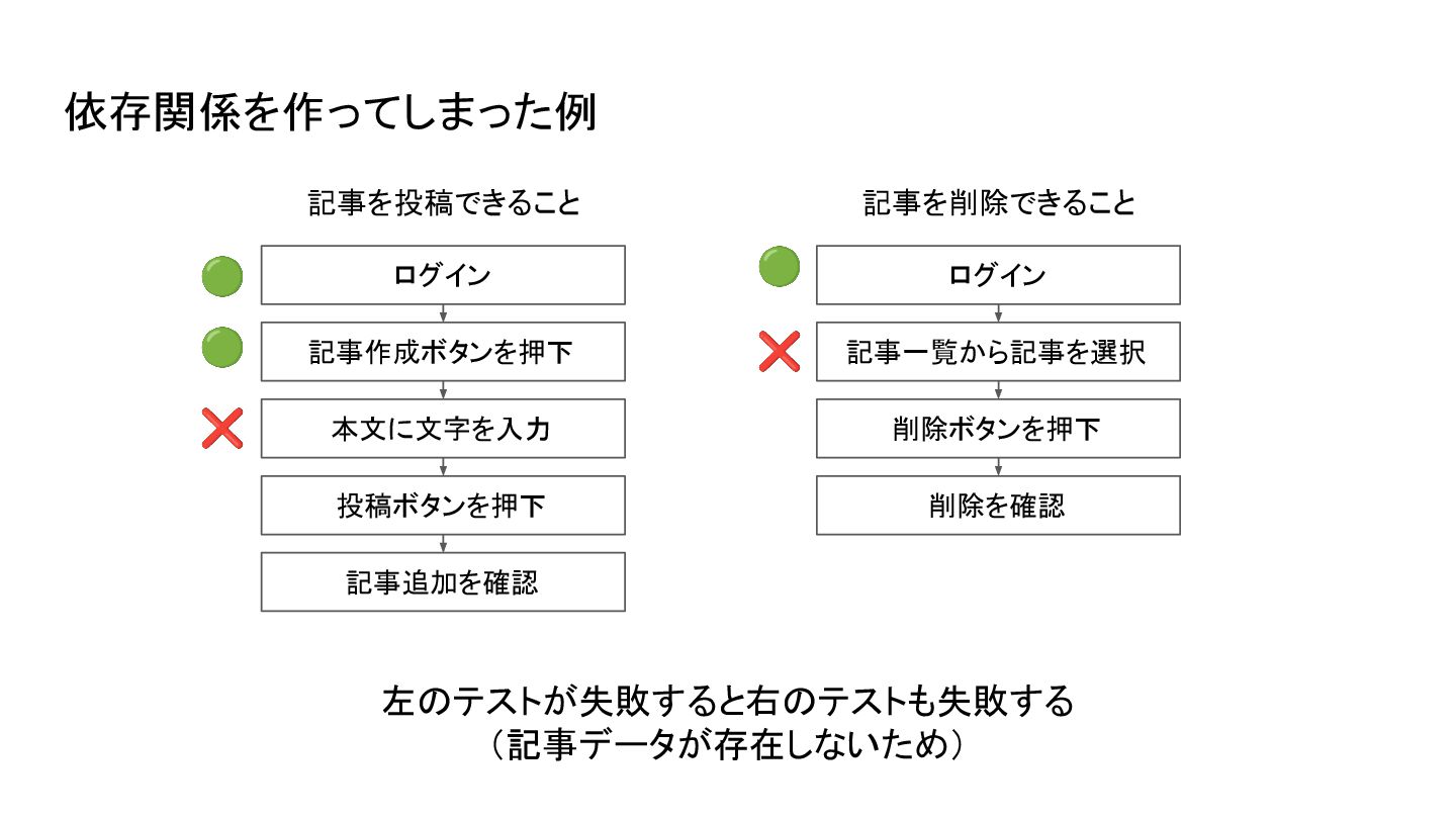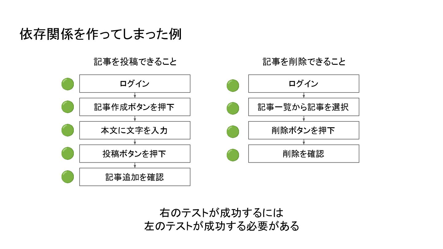 🟢 🟢 ❌ 依存関係を作ってしまった例 記事を削除できること 記事を投稿できること 🟢 左のテストが失敗すると右のテストも失敗する (記事データが存在しないため)