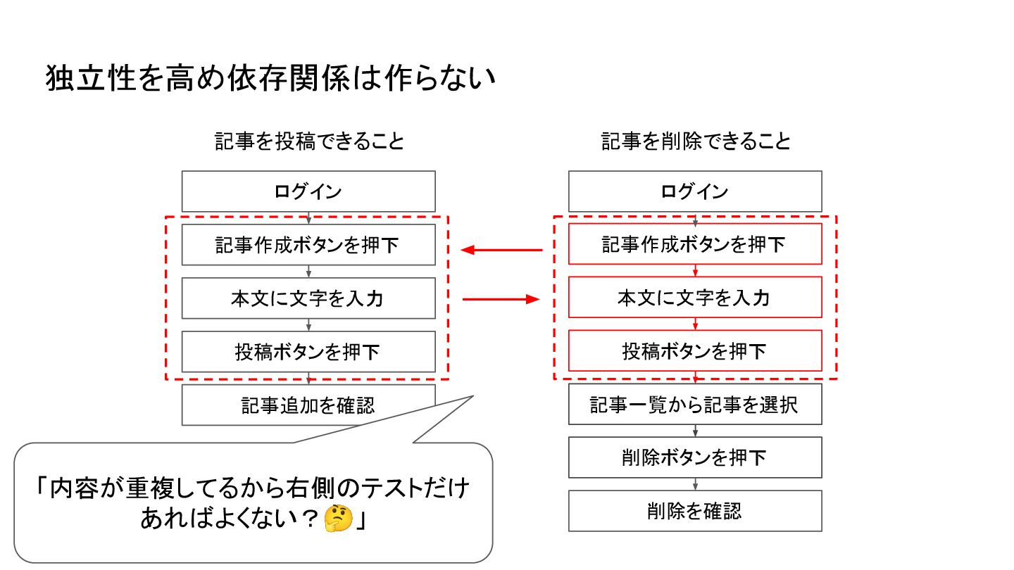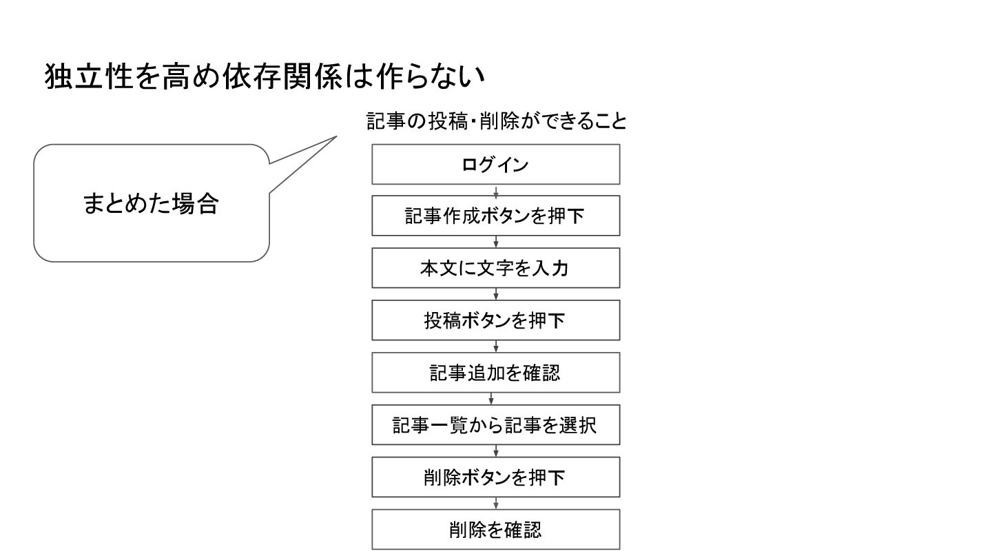 依存関係を作ってしまった例 記事を削除できること 記事を投稿できること ログイン 記事作成ボタンを押下 本文に文字を入力 投稿ボタンを押下 記事追加を確認 ログイン 記事一覧から記事を選択