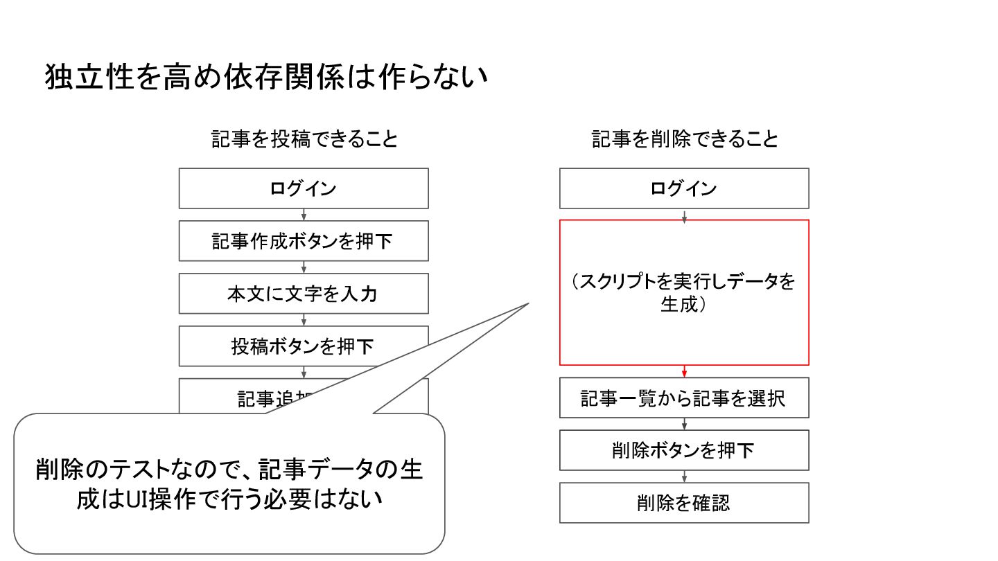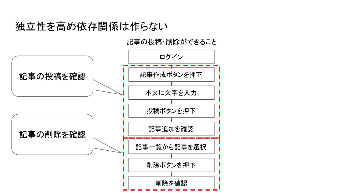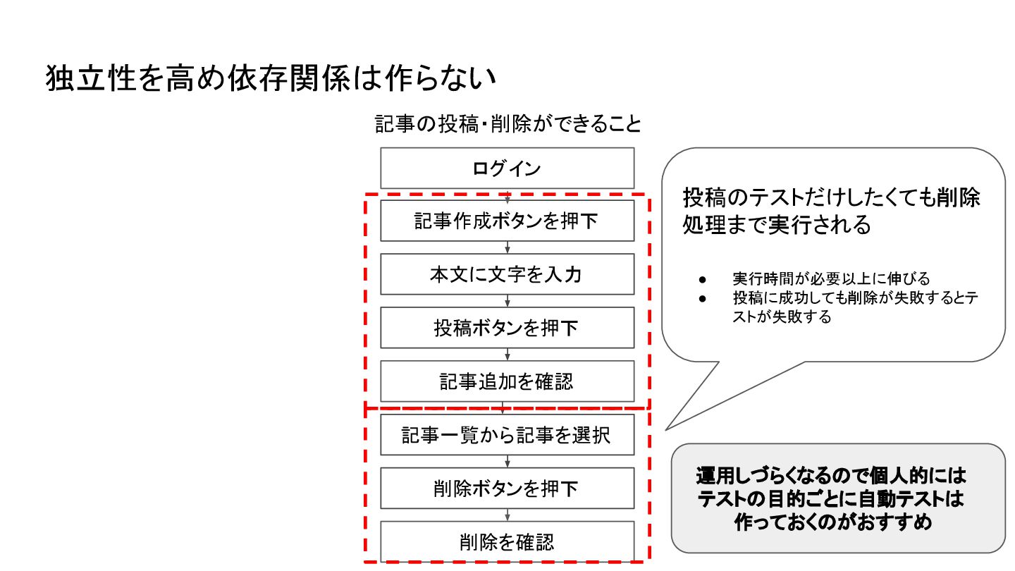 運用しづらくなるので個人的には テストの目的ごとに自動テストは 作っておくのがおすすめ 投稿のテストだけしたくても削除 処理まで実行される • 実行時間が必要以上に伸びる • 投稿に成功しても削除が失敗するとテ ストが失敗する