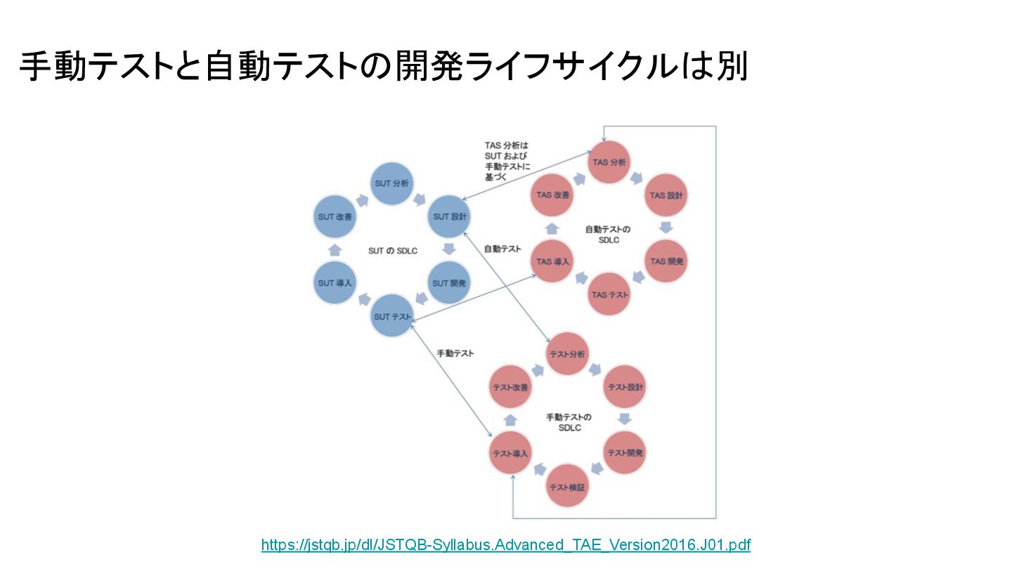 手動テストと自動テストの開発ライフサイクルは別 https://jstqb.jp/dl/JSTQB-Syllabus.Advanced_TAE_Version2016.J01.pdf