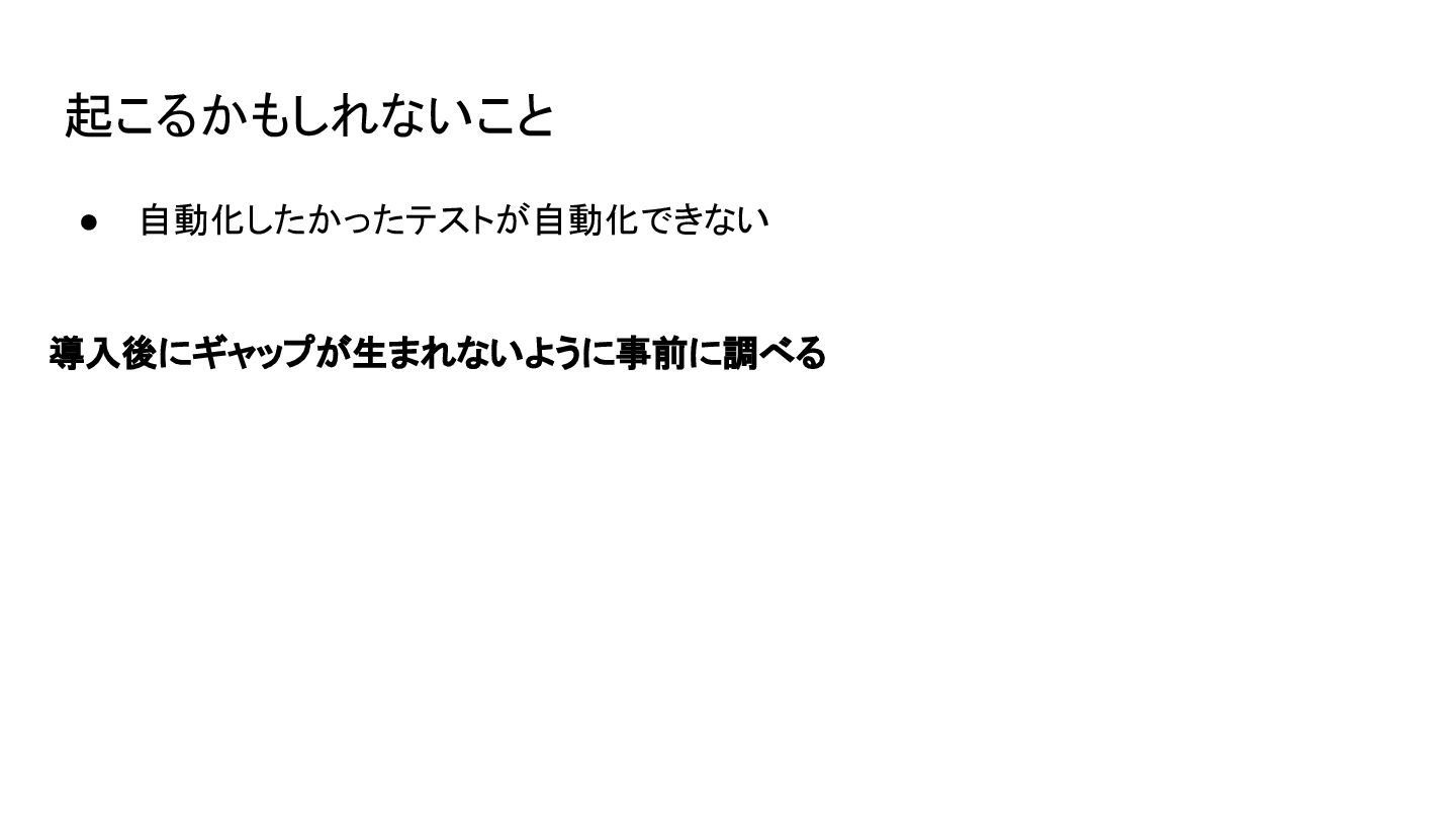 • 自動化したかったテストが自動化できない 導入後にギャップが生まれないように事前に調べる 起こるかもしれないこと