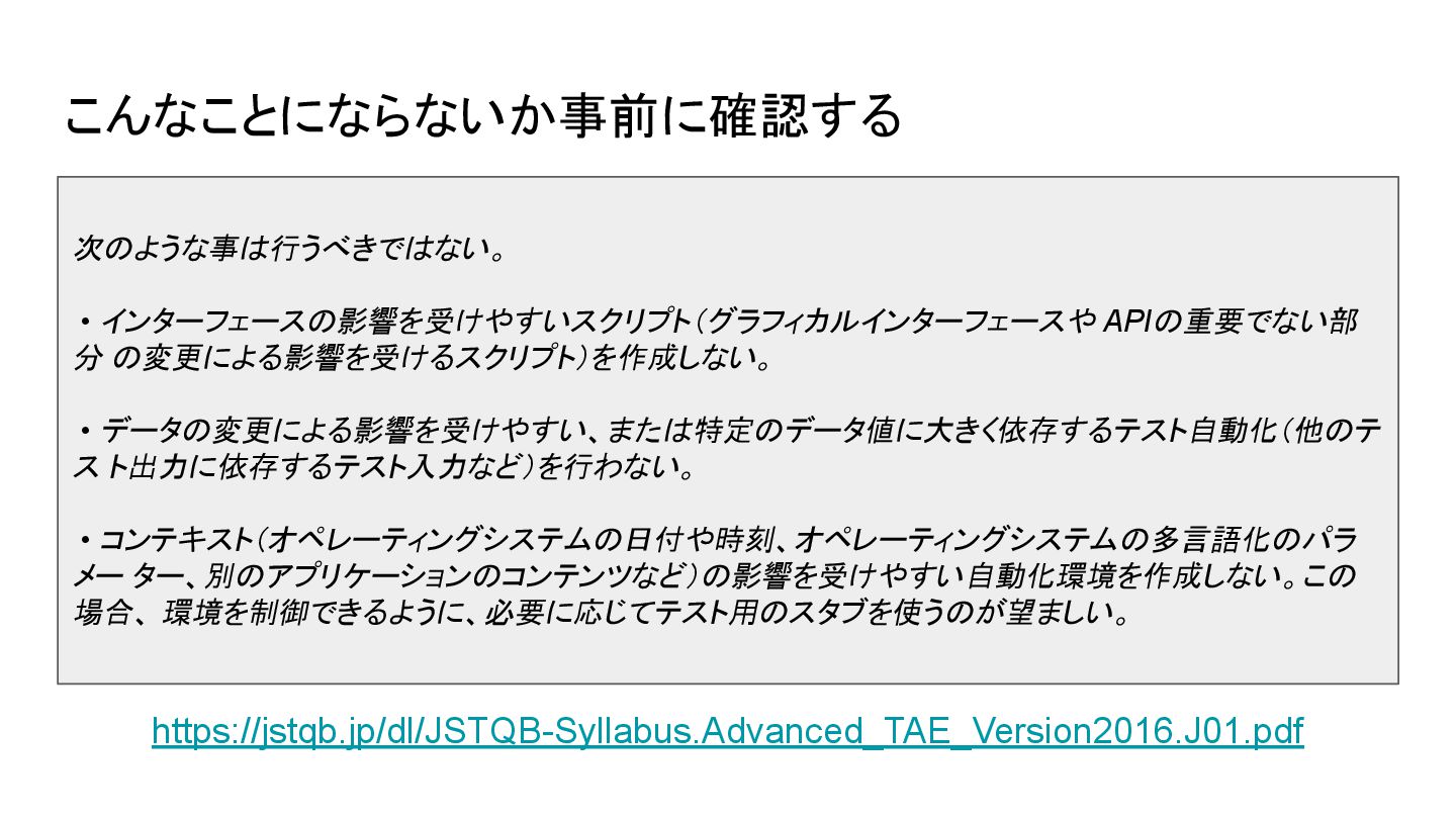 ト出力に依存するテスト入力など)を行わない。 • コンテキスト(オペレーティングシステムの日付や時刻、オペレーティングシステムの多言語化のパラ メー ター、別のアプリケーションのコンテンツなど)の影響を受けやすい自動化環境を作成しない。この 場合、 環境を制御できるように、必要に応じてテスト用のスタブを使うのが望ましい。 https://jstqb.jp/dl/JSTQB-Syllabus.Advanced_TAE_Version2016.J01.pdf