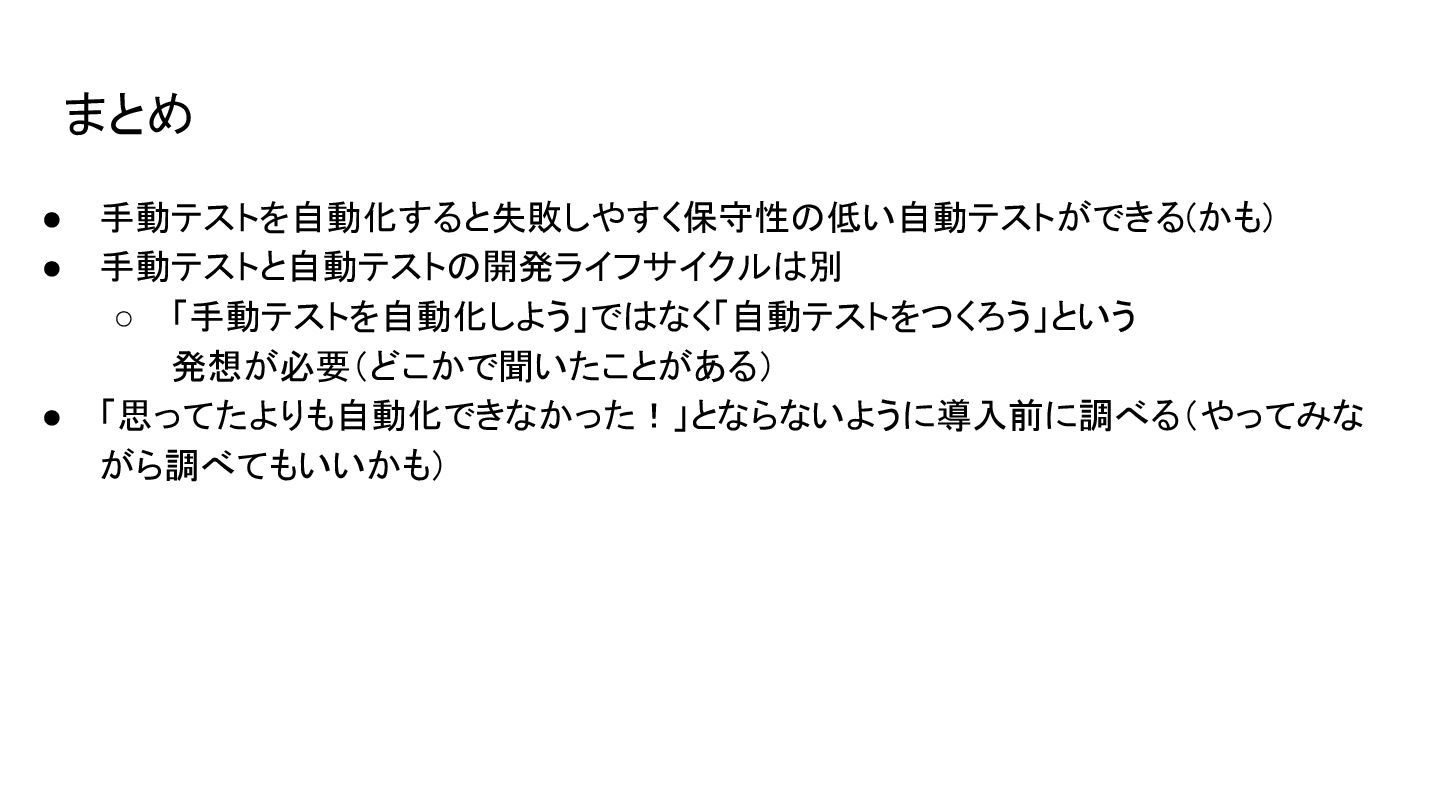 まとめ • 手動テストを自動化すると失敗しやすく保守性の低い自動テストができる(かも) • 手動テストと自動テストの開発ライフサイクルは別 ◦ 「手動テストを自動化しよう」ではなく「自動テストをつくろう」という 発想が必要(どこかで聞いたことがある) • 「思ってたよりも自動化できなかった!」とならないように導入前に調べる(やってみな