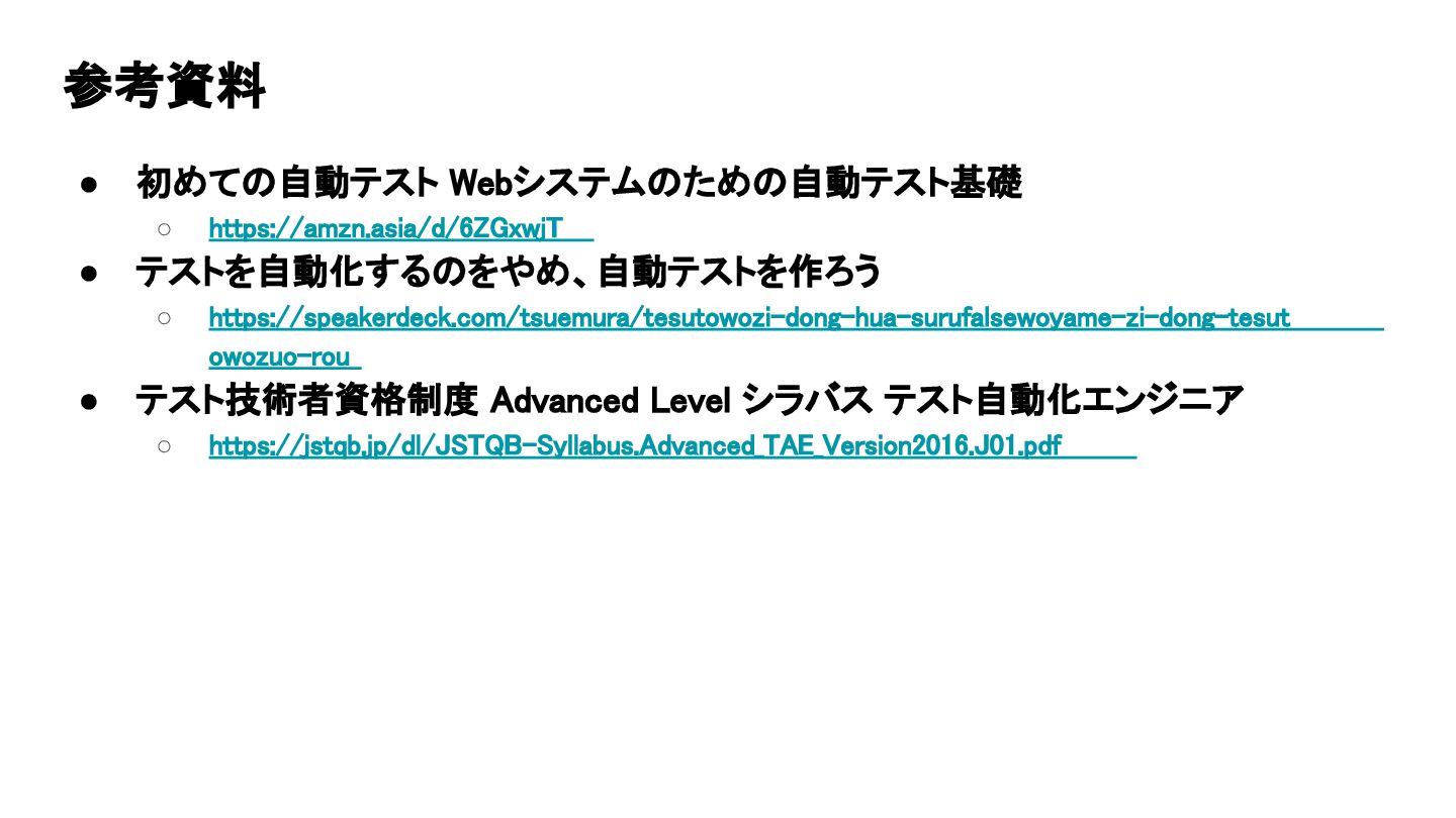 ◦ https://speakerdeck.com/tsuemura/tesutowozi-dong-hua-surufalsewoyame-zi-dong-tesut owozuo-rou • テスト技術者資格制度 Advanced Level シラバス テスト自動化エンジニア ◦ https://jstqb.jp/dl/JSTQB-Syllabus.Advanced_TAE_Version2016.J01.pdf 参考資料