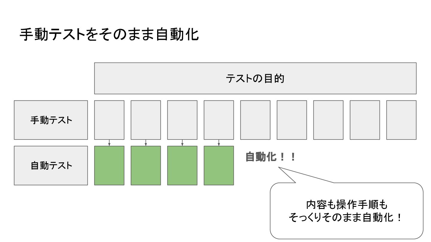 テストの目的 手動テスト 自動テスト 手動テストをそのまま自動化 自動化!! 内容も操作手順も そっくりそのまま自動化!
