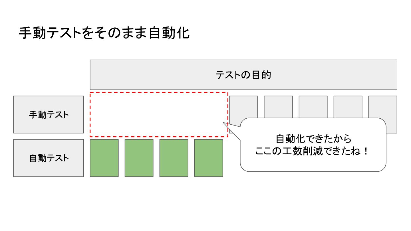 テストの目的 手動テスト 自動テスト 自動化できたから ここの工数削減できたね! 手動テストをそのまま自動化