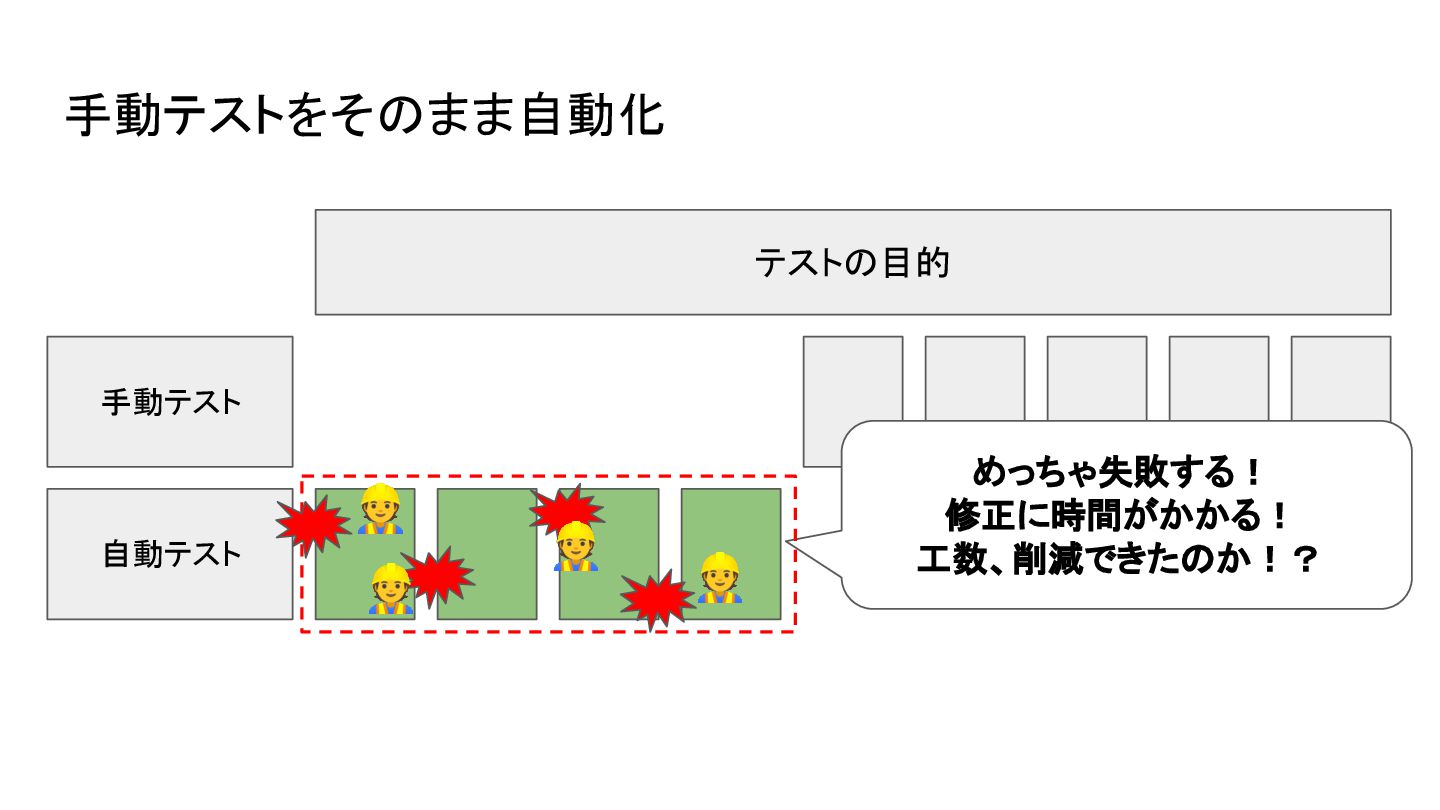 テストの目的 手動テスト 自動テスト めっちゃ失敗する! 修正に時間がかかる! 工数、削減できたのか!? 手動テストをそのまま自動化 👷 👷 👷