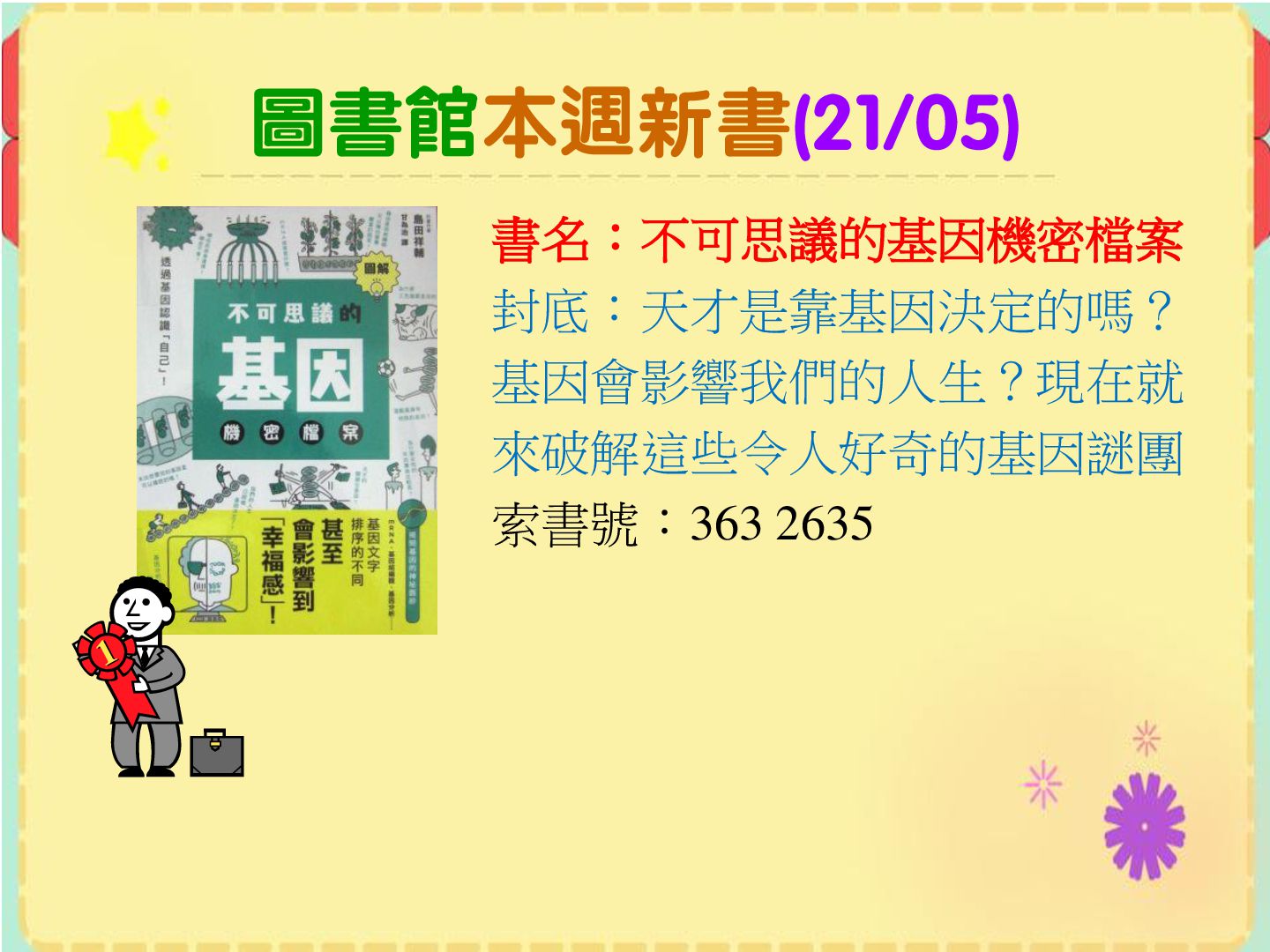 圖書館本週新書(21/05) 書名:不可思議的基因機密檔案 封底:天才是靠基因決定的嗎? 基因會影響我們的人生?現在就 來破解這些令人好奇的基因謎團 索書號:363 2635