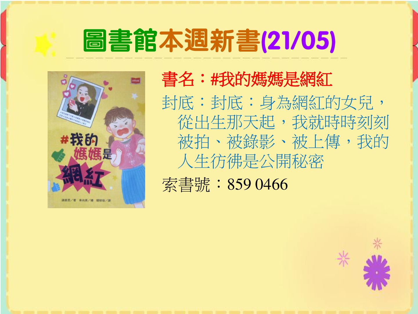 圖書館本週新書(21/05) 書名:#我的媽媽是網紅 封底:封底:身為網紅的女兒, 從出生那天起,我就時時刻刻 被拍、被錄影、被上傳,我的 人生彷彿是公開秘密 索書號:859 0466