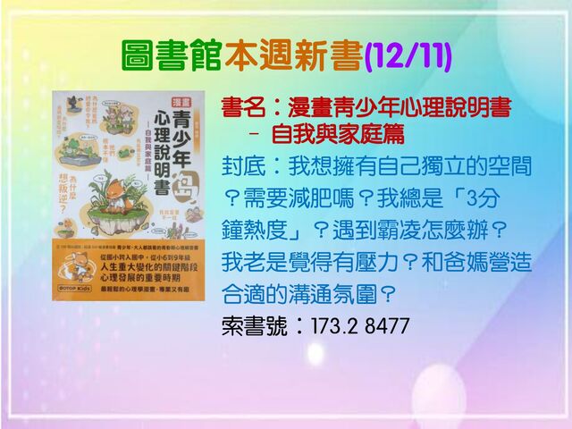 圖書館本週新書(12/11) 書名:漫畫青少年心理說明書 – 自我與家庭篇 封底:我想擁有自己獨立的空間 ?需要減肥嗎?我總是「3分 鐘熱度」?遇到霸凌怎麼辦? 我老是覺得有壓力?和爸媽營造 合適的溝通氛圍? 索書號:173.2