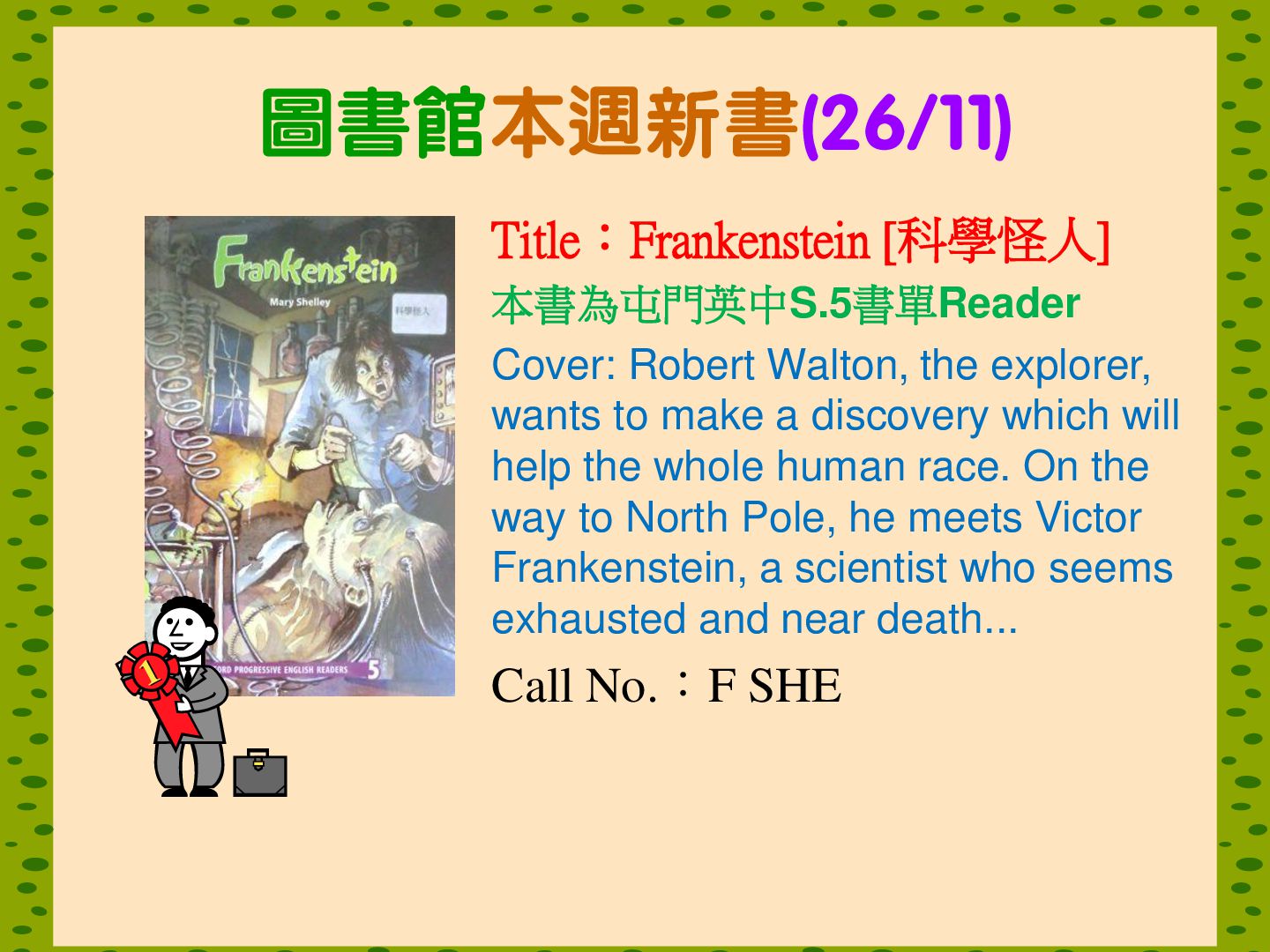 to make a discovery which will help the whole human race. On the way to North Pole, he meets Victor Frankenstein, a scientist who seems exhausted and near death... Call No.:F SHE