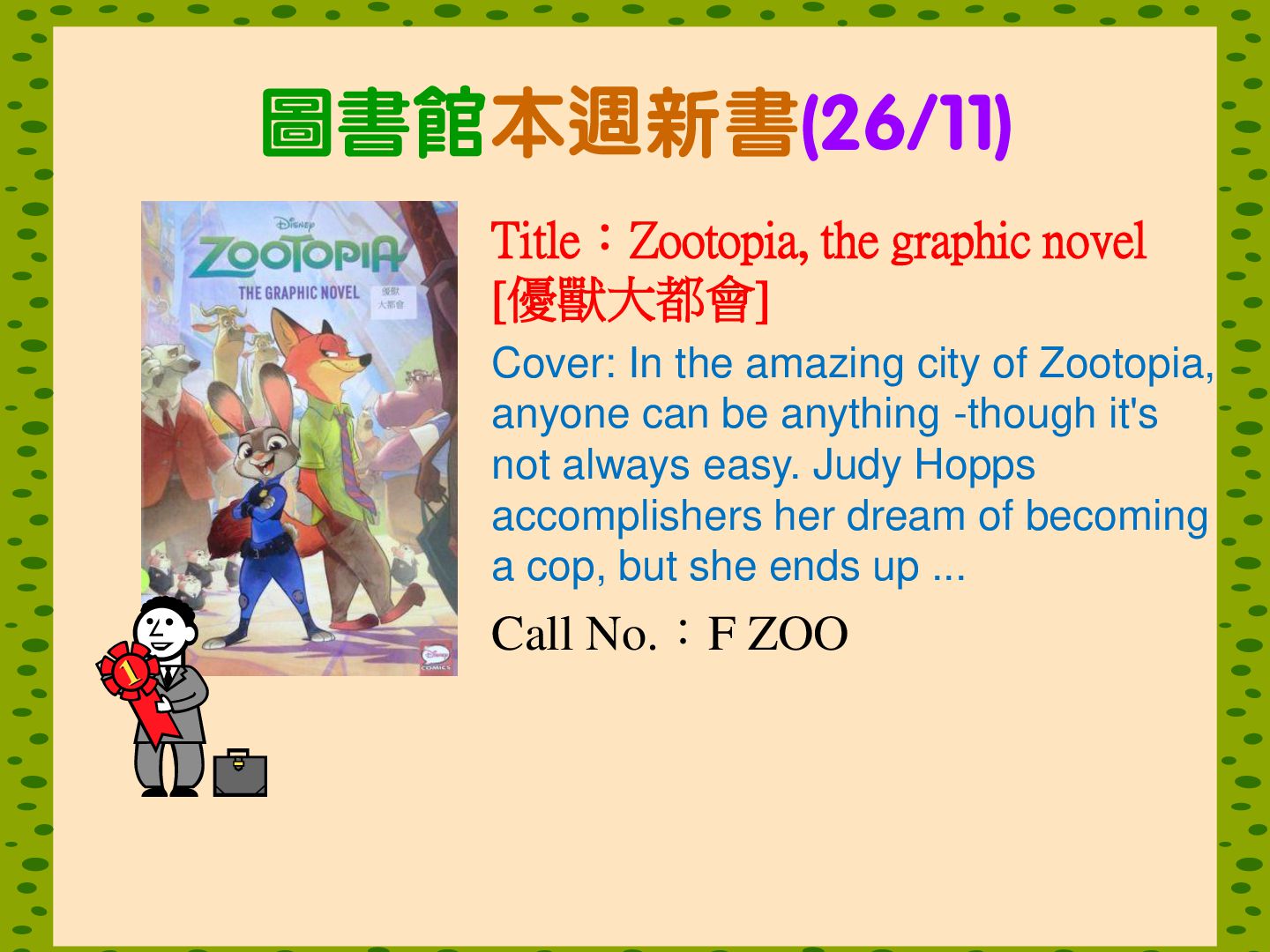 city of Zootopia, anyone can be anything -though it's not always easy. Judy Hopps accomplishers her dream of becoming a cop, but she ends up ... Call No.:F ZOO