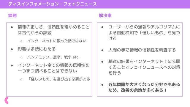 パンデミック,選挙,戦争 etc. • インターネット全ての情報の信頼性を 一つずつ調べることはできない ◦ 「怪しいもの」を選び出す必要がある • ユーザーからの通報やアルゴリズムに よる自動検知で「怪しいもの」を見つ ける • 人間の手で情報の信頼性を精査する • 精査の結果をインターネット上に公開 することでフェイクニュースへの対策 を行う • 近年問題が大きくなった分野でもある ため,改善の余地が多くある! 解決案
