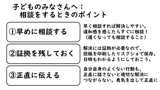 子どものみなさんへ: 相談をするときのポイント ①早めに相談する ②証拠を残しておく ③正直に伝える 早く相談すれば解決しやすい。 違和感を感じたらすぐに相談! (遅くなっても相談すること) 解決には証拠が必要なので、 投稿を印刷したりスクショで保存。