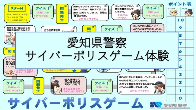 2019.03.17に行われた、第11回愛知県青少年育成アドバイザー研究集会in豊田でのワークショップでの内容 愛知県警察『サイバーポリスゲーム』については、下記サイトから確認可能。 https://www.pref.aichi.jp/police/anzen/cyber/cyberpolicegame.html