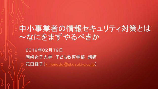 中小事業者の情報セキュリティ対策とは ~なにをまずやるべきか 2019年02月19日 岡崎女子大学 子ども教育学部 講師 花田経子(