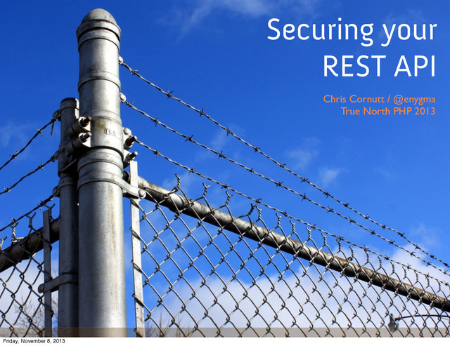 With APIs becoming the de-facto standard for getting things done on the web, it's more important than ever to provide the right kind of security for your application. The options can be overwhelming with things like OAuth, signed queries, shared certificates and token authentication just to name a few. I'll go through these and some of the questions you'll need to ask as you think about protecting your API and the data that lies within.