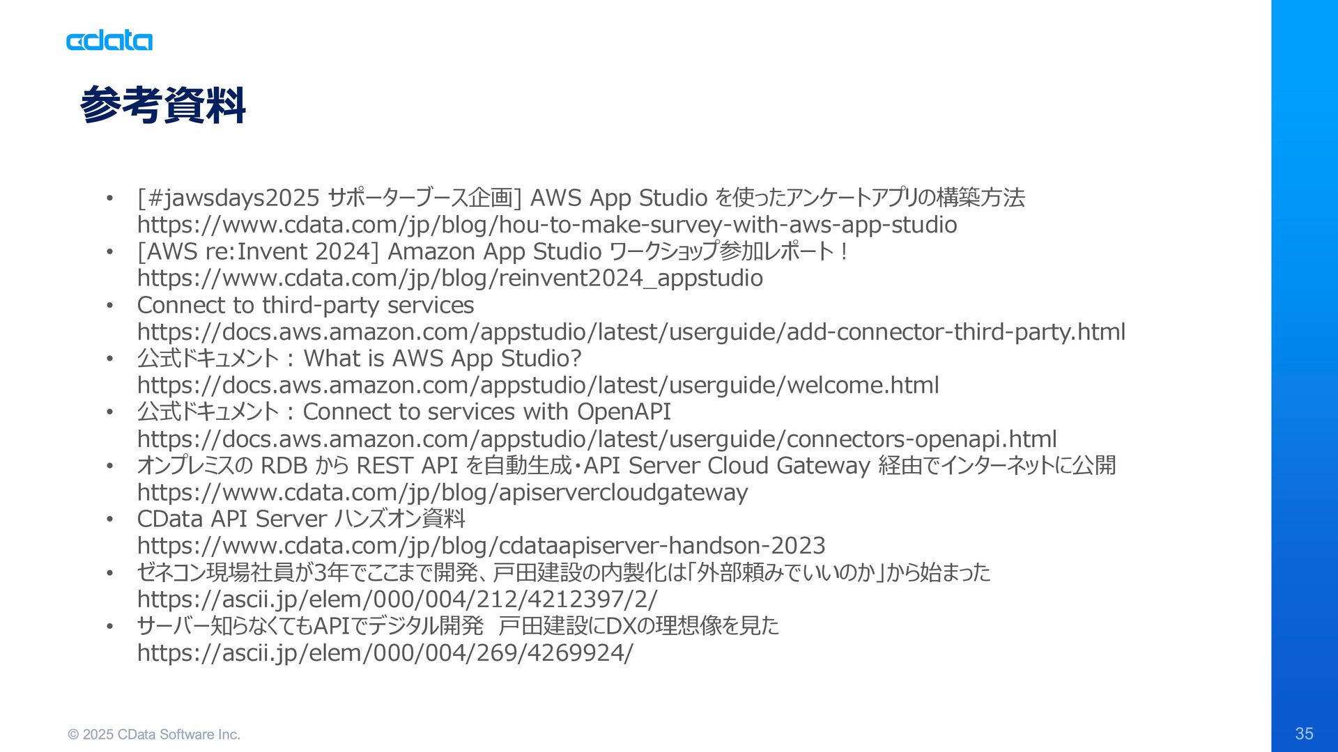 アプリケーション開発を行う際にAPI の仕様が不明だったり、そもそもAPI が用意されていないなどの経験がある開発者は多いのではないでしょうか。このセッションではJAWS DAYS 2025 のブース企画としてCData API Server を使ってノーコードでAPI を自動生成し、AWS App StudioでWell-Architected なアンケートアプリを構築したケースを例に、ノーコードで世界標準のAPI とドキュメントを生成する一番早くて簡単な方法を紹介します。