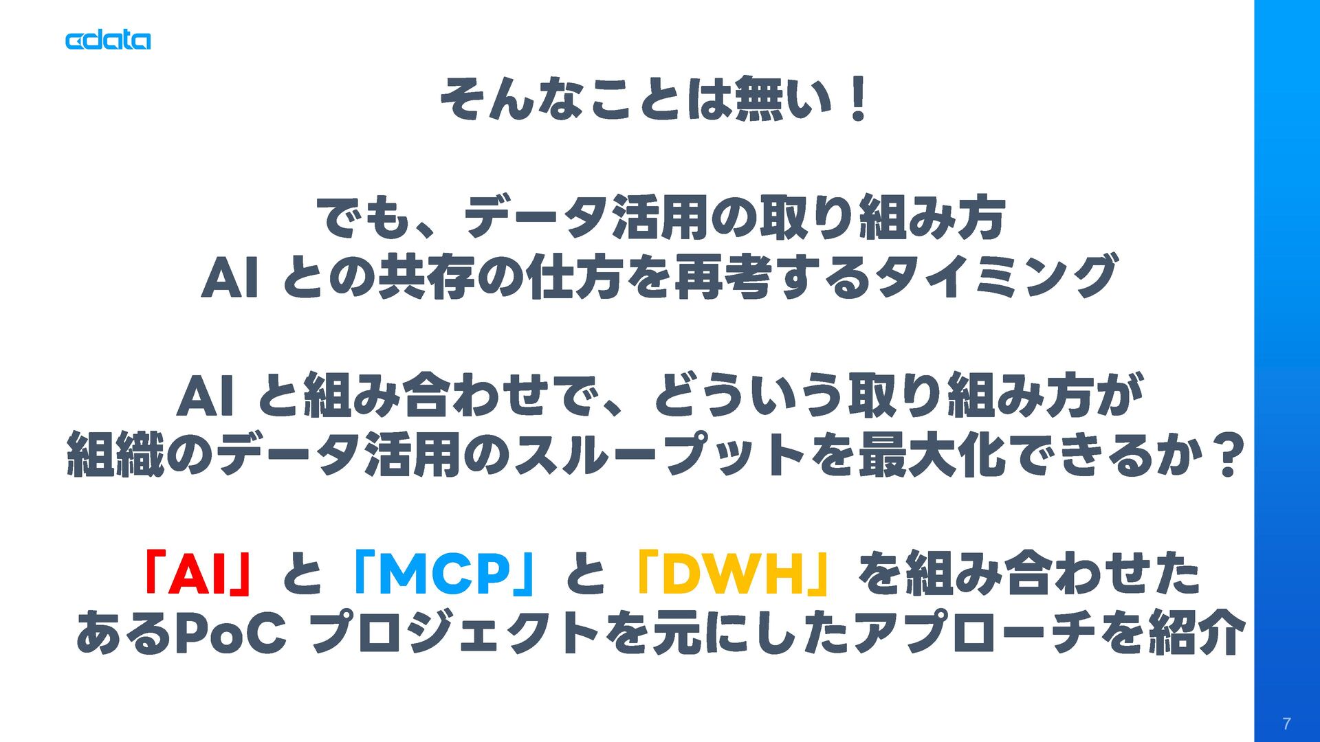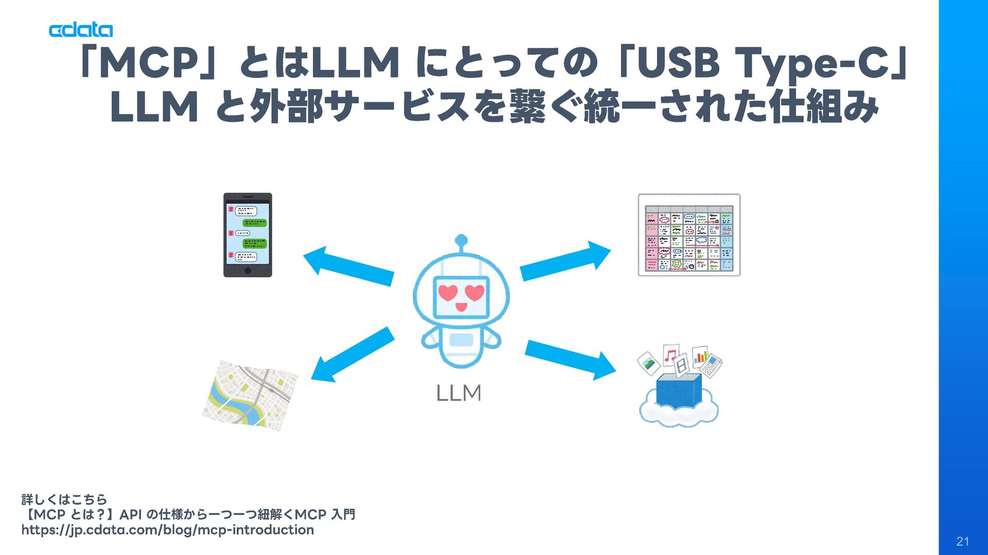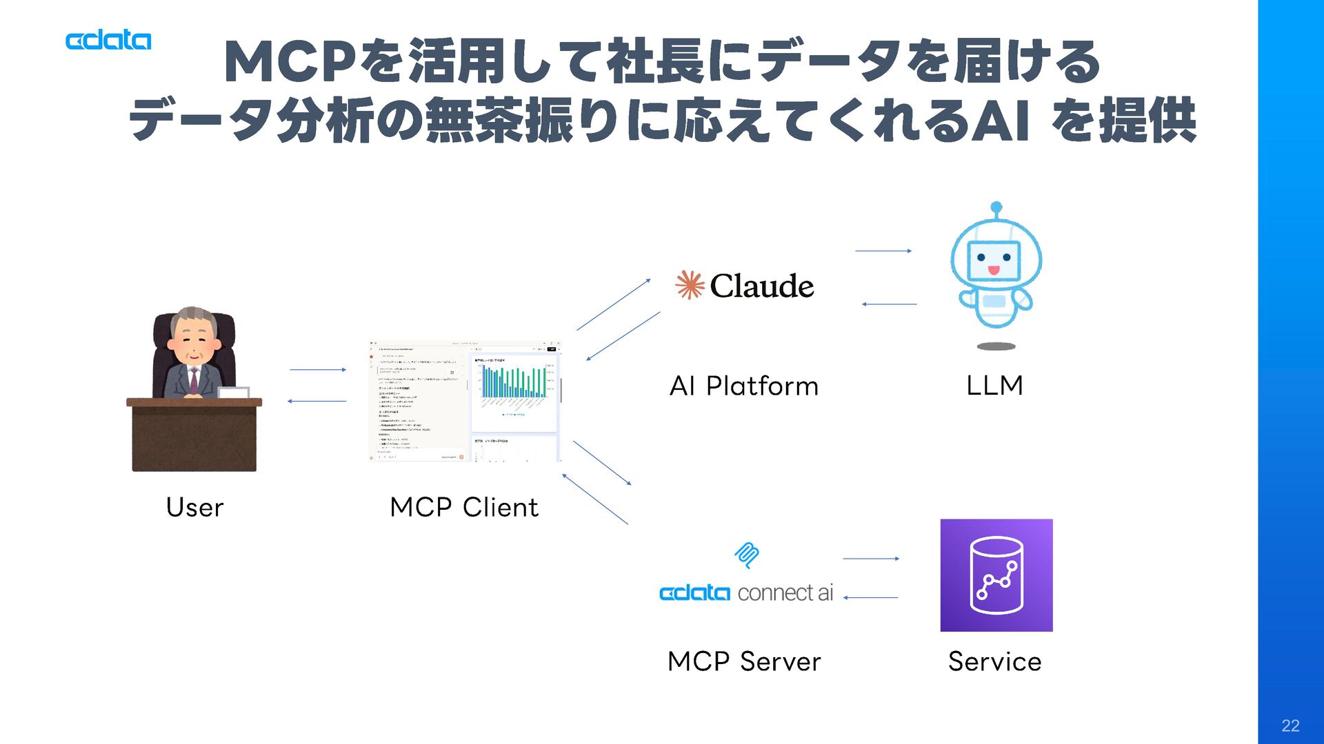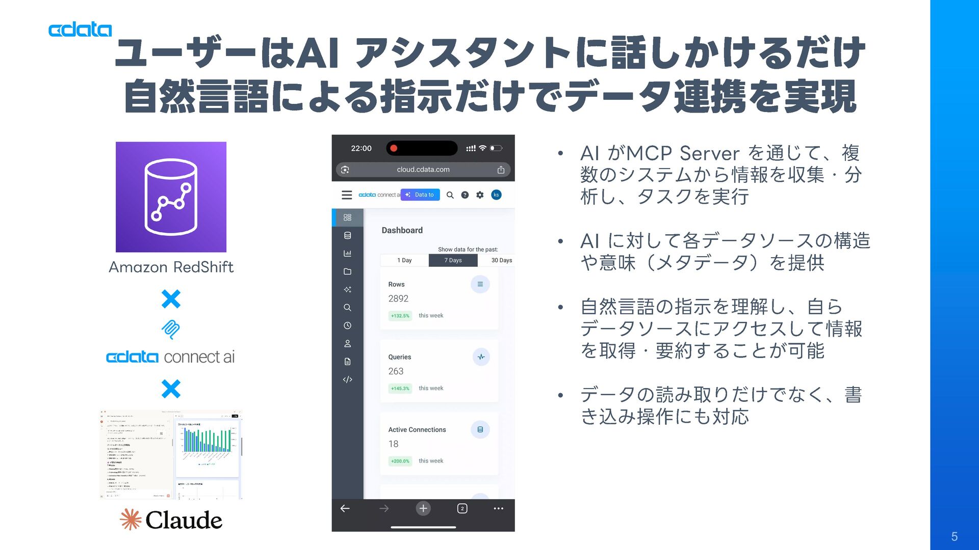 AI エージェントと外部サービスの連携をサポートする「MCP」というテクノロジーが注目を集めています。この「MCP」を利用することで、Claude やAmazon Bedrock などのAI にAmazon RedShift との連携機能をサポートさせ、自社のデータに基づきながらダッシュボード作りやデータのインサイトの発見を支援させる「AI エージェント型BI ツール」のように利用することも可能です。 このセッションでは「MCP」の仕組みの解説と共に、AI エージェントとAmazon RedShift を組み合わせることで、データ分析でどのようなことが可能になるのかデモを交えながら紹介します。