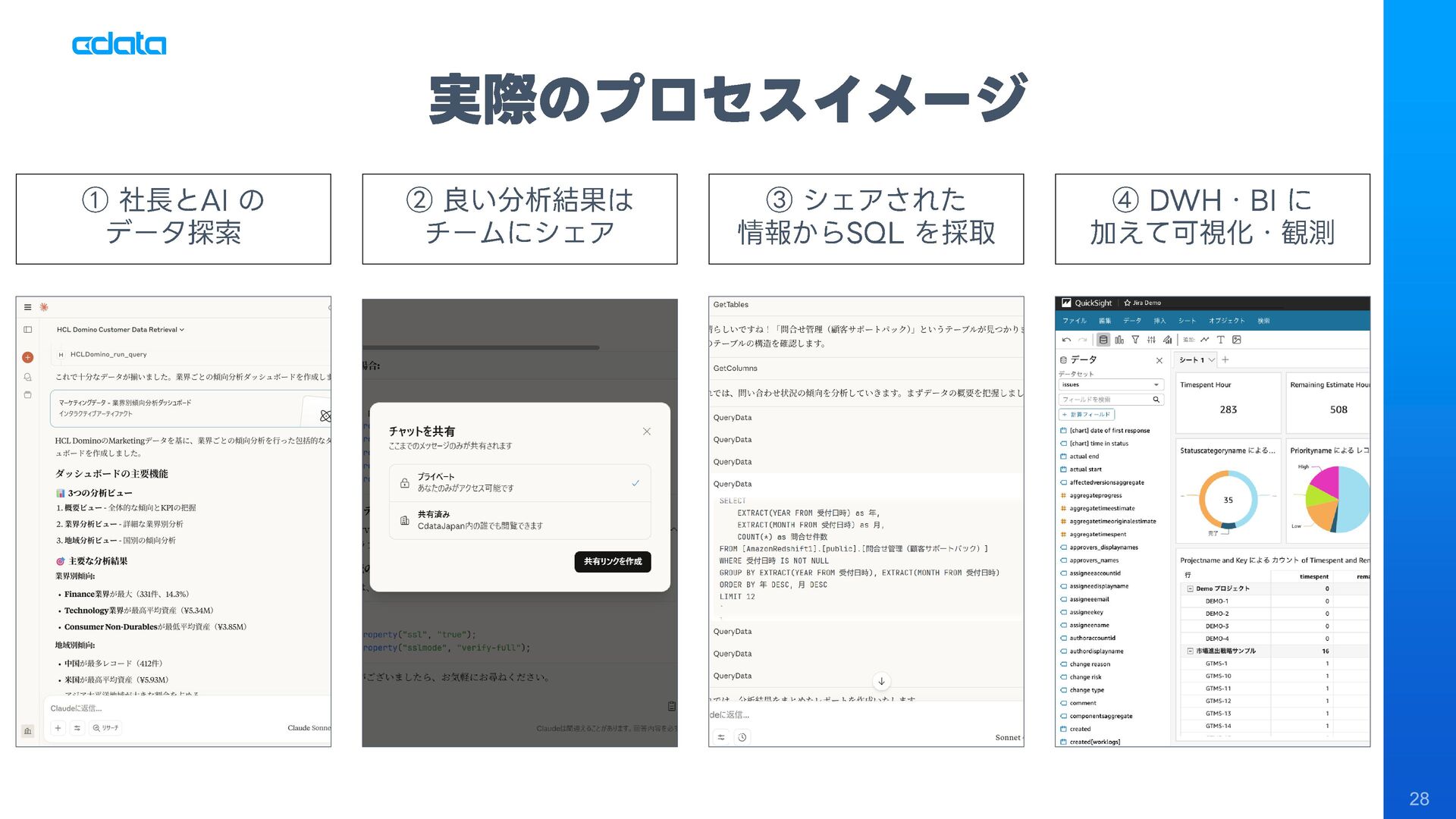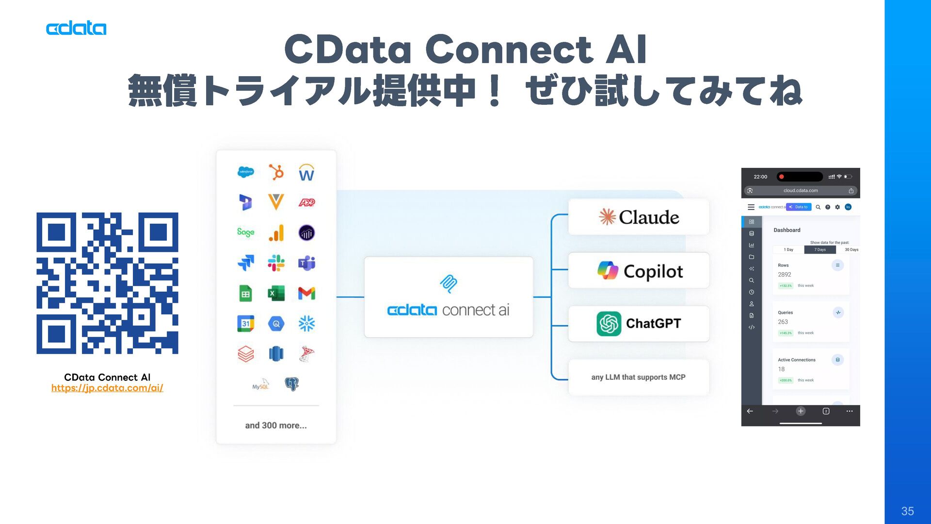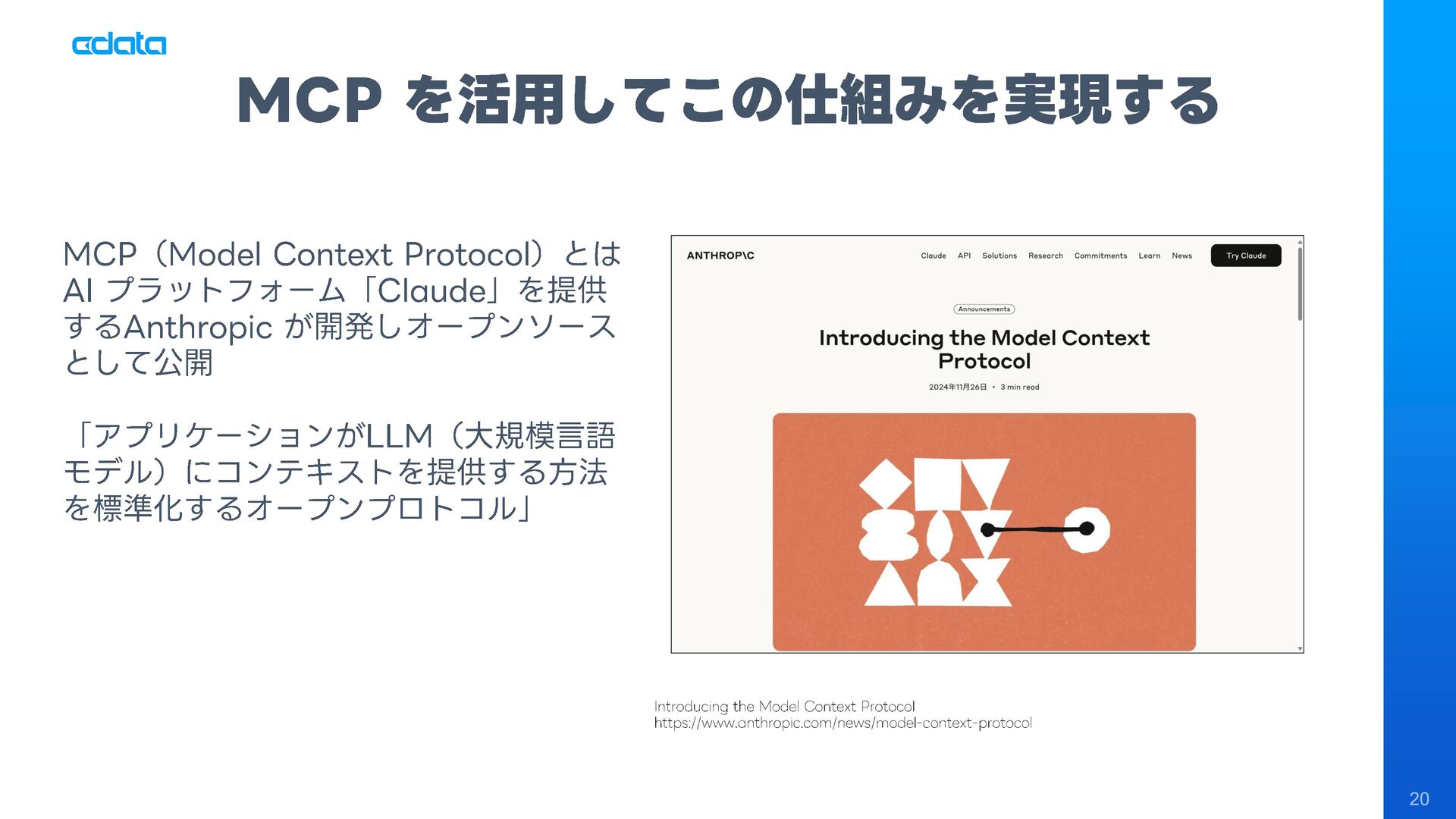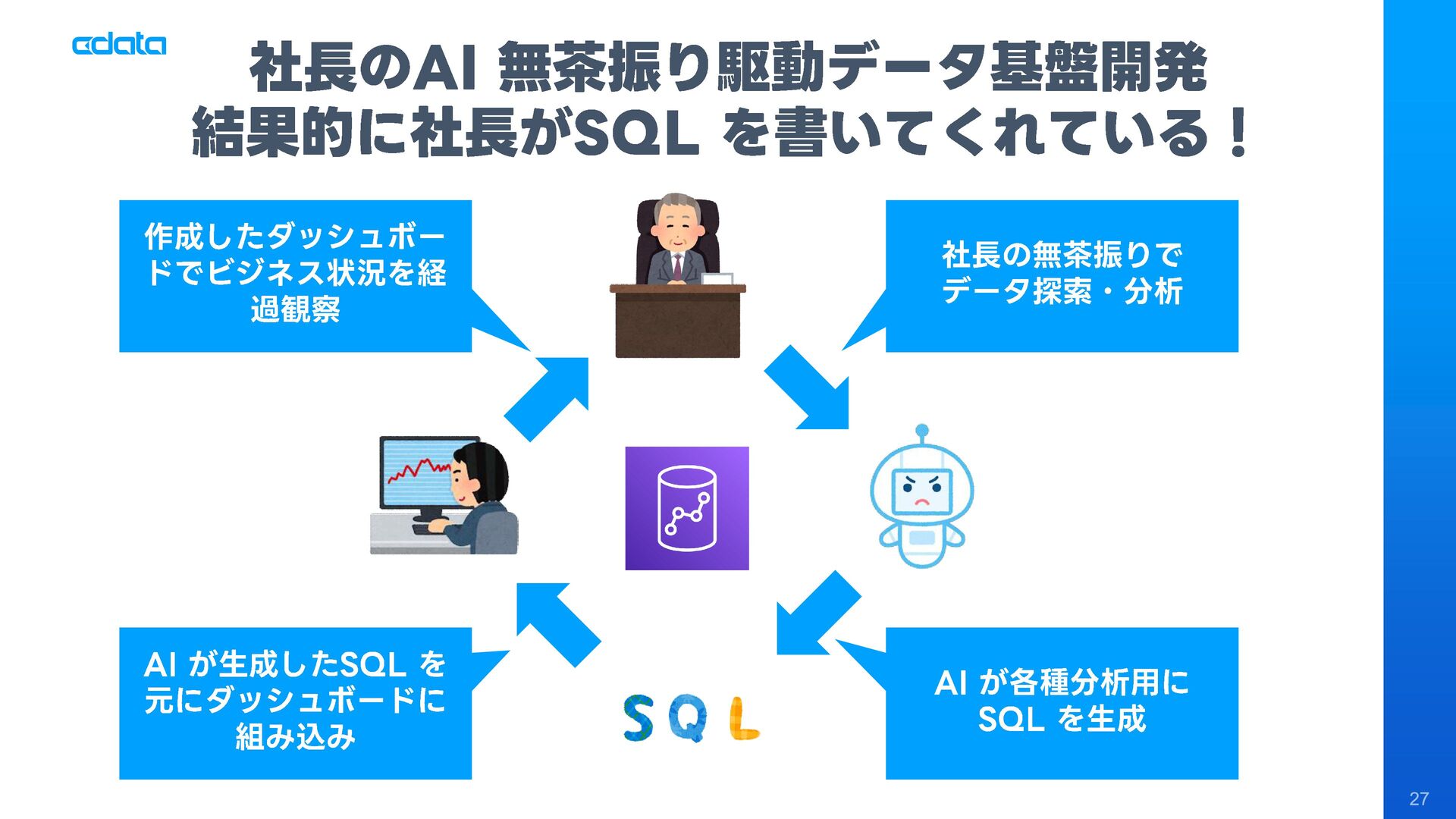 AI エージェントと外部サービスの連携をサポートする「MCP」というテクノロジーが注目を集めています。この「MCP」を利用することで、Claude やAmazon Bedrock などのAI にAmazon RedShift との連携機能をサポートさせ、自社のデータに基づきながらダッシュボード作りやデータのインサイトの発見を支援させる「AI エージェント型BI ツール」のように利用することも可能です。 このセッションでは「MCP」の仕組みの解説と共に、AI エージェントとAmazon RedShift を組み合わせることで、データ分析でどのようなことが可能になるのかデモを交えながら紹介します。