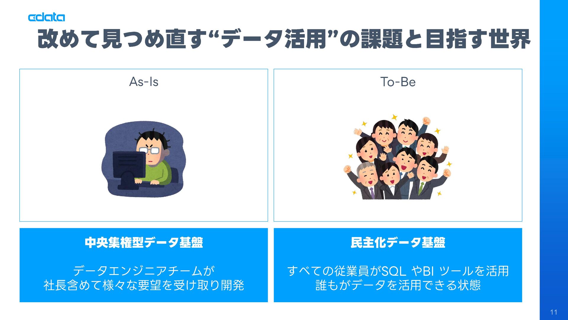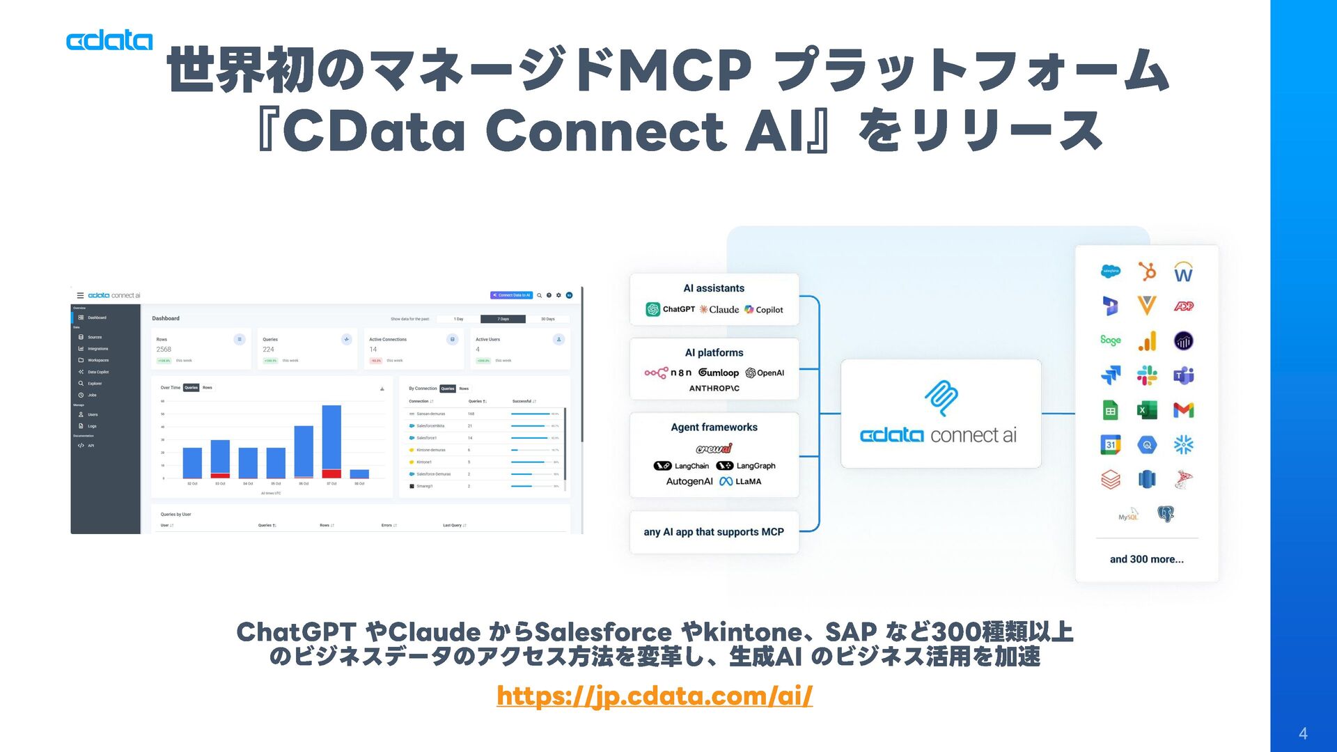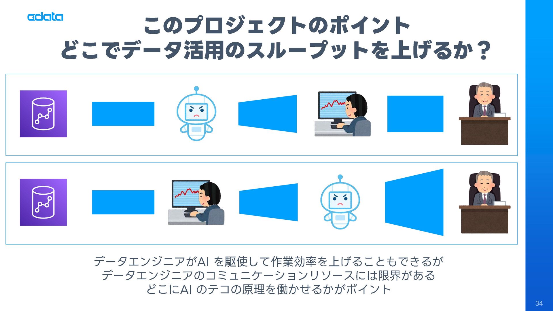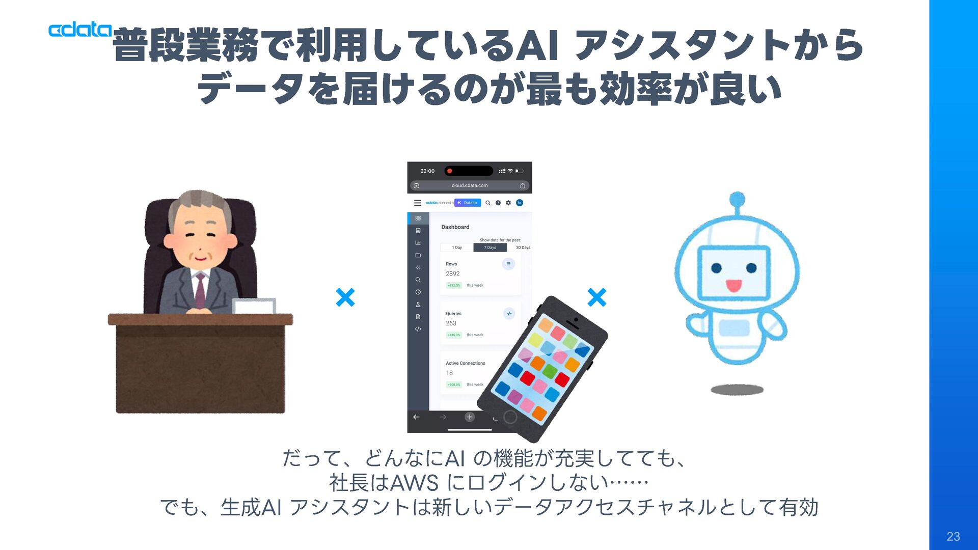 AI エージェントと外部サービスの連携をサポートする「MCP」というテクノロジーが注目を集めています。この「MCP」を利用することで、Claude やAmazon Bedrock などのAI にAmazon RedShift との連携機能をサポートさせ、自社のデータに基づきながらダッシュボード作りやデータのインサイトの発見を支援させる「AI エージェント型BI ツール」のように利用することも可能です。 このセッションでは「MCP」の仕組みの解説と共に、AI エージェントとAmazon RedShift を組み合わせることで、データ分析でどのようなことが可能になるのかデモを交えながら紹介します。