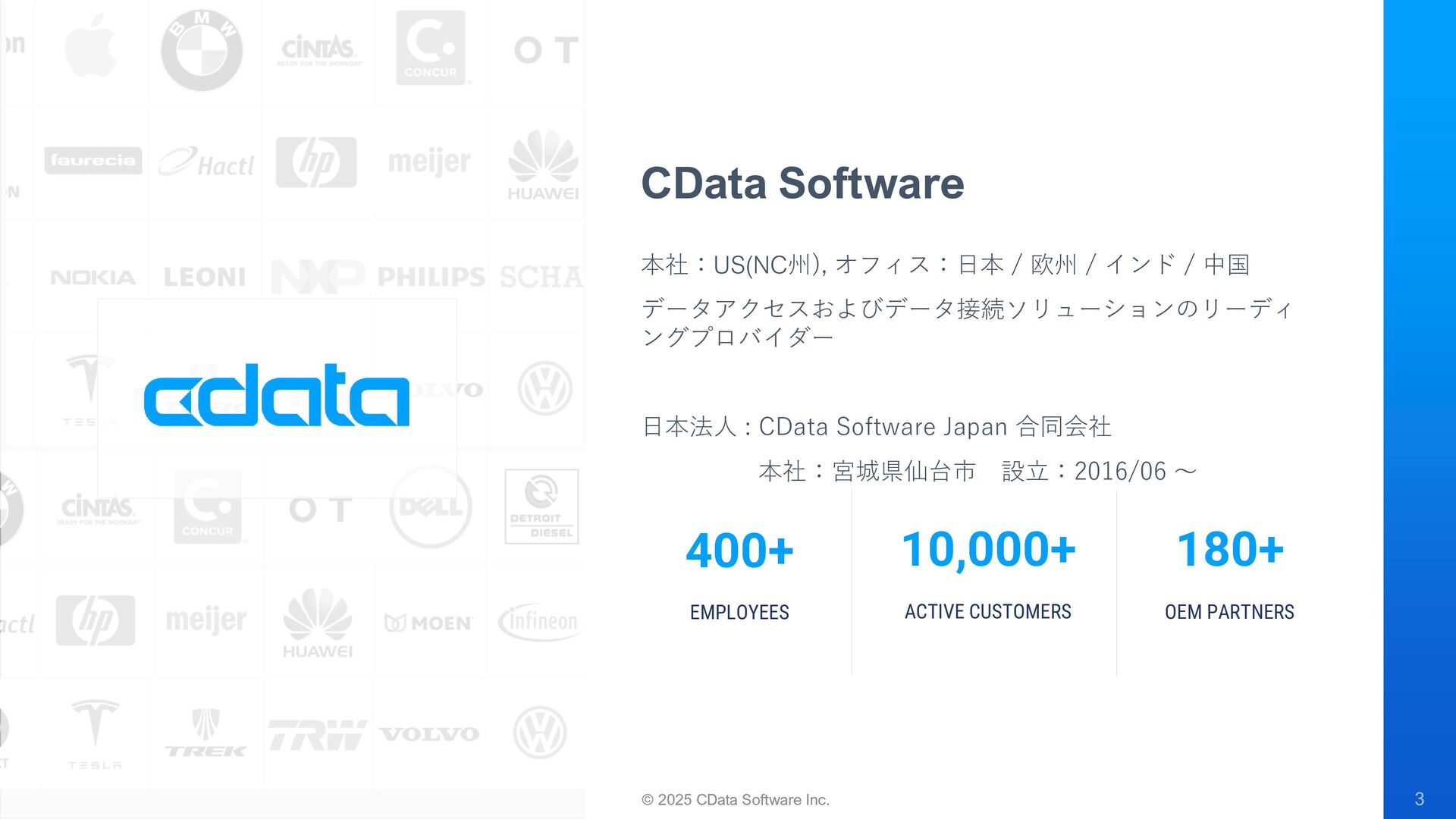 ングプロバイダー 日本法人 : CData Software Japan 合同会社 本社:宮城県仙台市 設立:2016/06 〜 © 2025 CData Software Inc. CData Software EMPLOYEES 400+ ACTIVE CUSTOMERS 10,000+ OEM PARTNERS 180+
