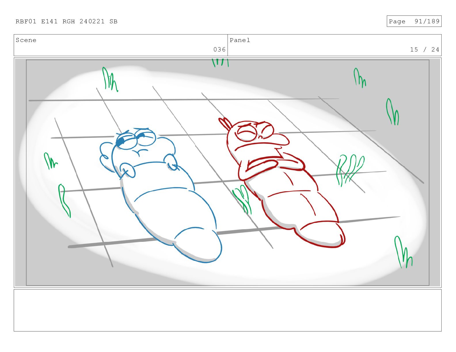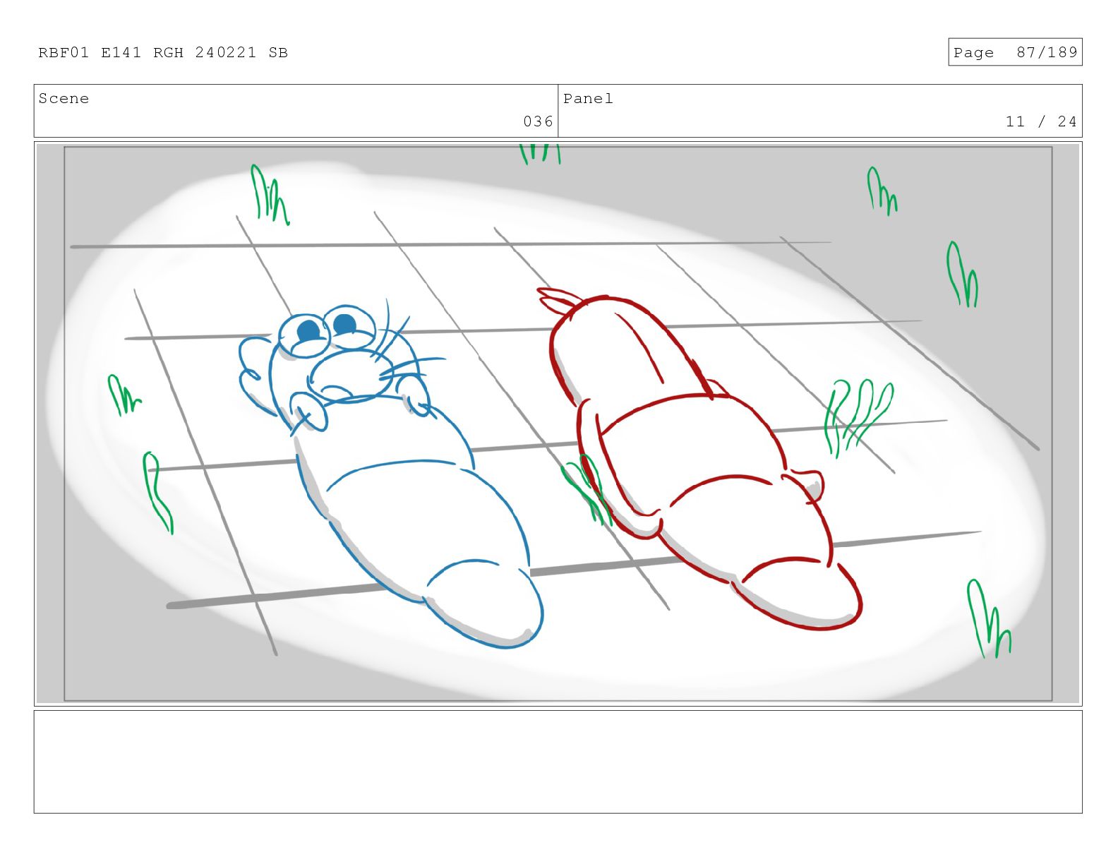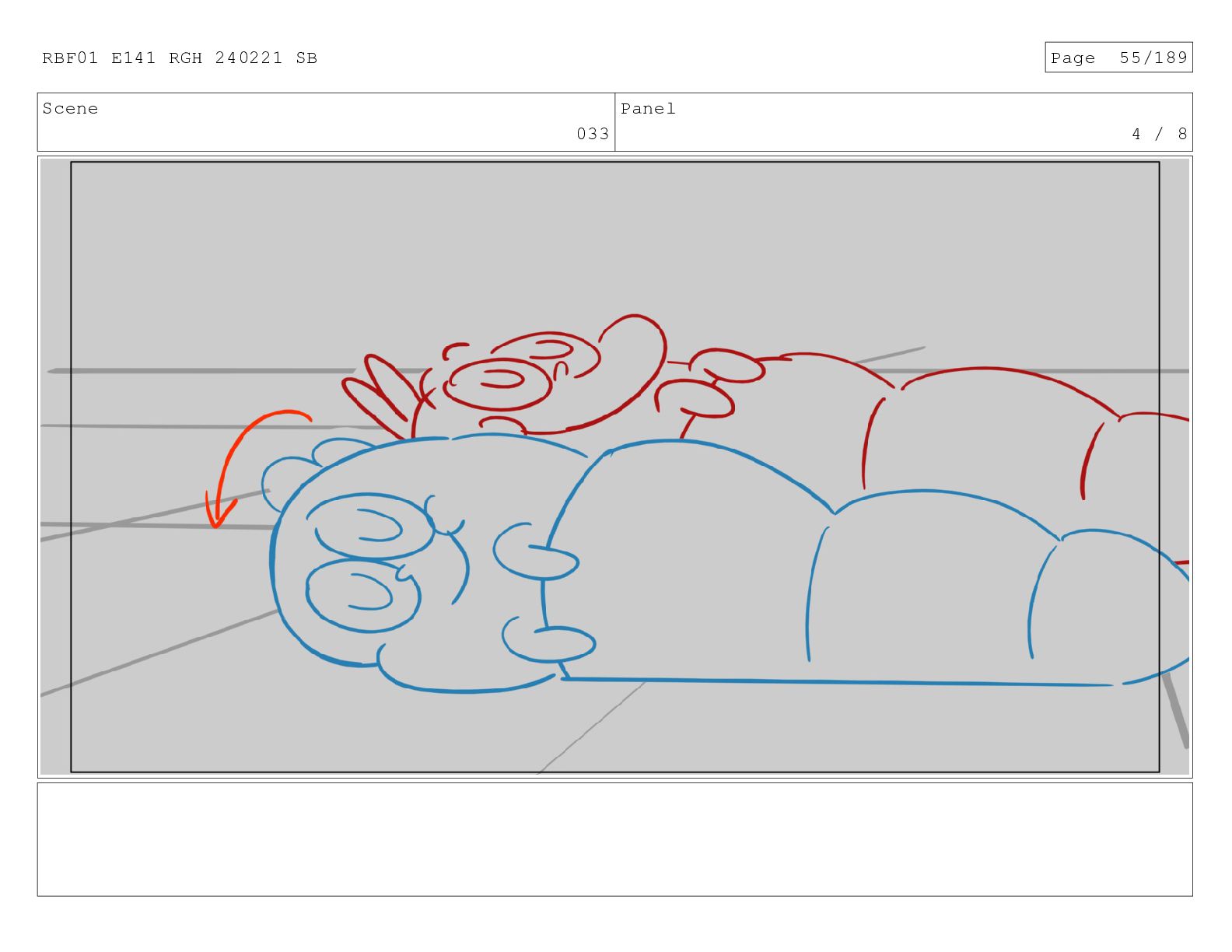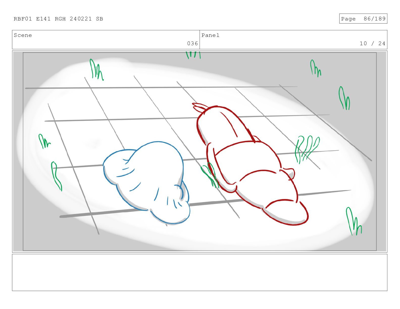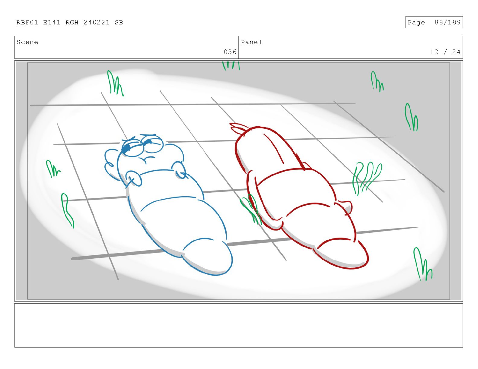 A section I boarded from the Netflix show Red Fish Blue Fish wherein Red and Blue look for a comfortable place to sleep. Director Katya Bowser plussed up some drawings.