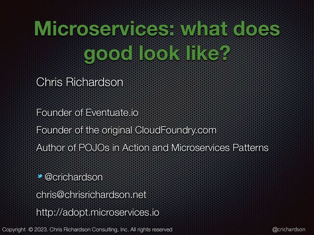 In this presentation I'll describe the key characteristics of the microservice architecture and how it differs from the monolithic architecture. You will learn when you should use microservices and when you should not. I'll describe the ideal developer experience when using the microservice architecture.You will also learn what other changes you must make to your organization when adopting microservices.