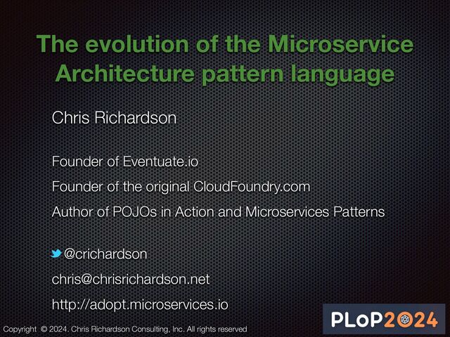 The microservice architecture pattern language is a collection of patterns for designing a microservice architecture. The pattern language came into existence on March 18th, 2014 with a Git commit to microservices.io that contained the first two patterns: monolithic architecture and microservice architecture. Since then it has grown to 40+ patterns. I gave a presentation about the pattern language at PLoP 2017. And, my best selling book, Microservices Patterns, was published in 2018.