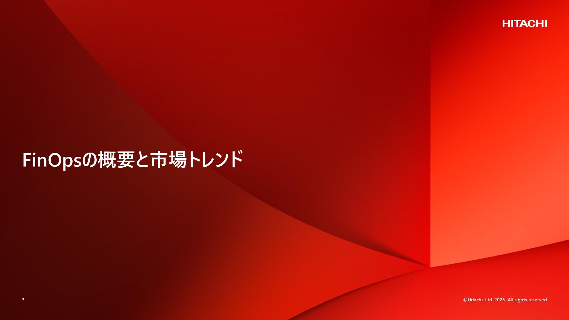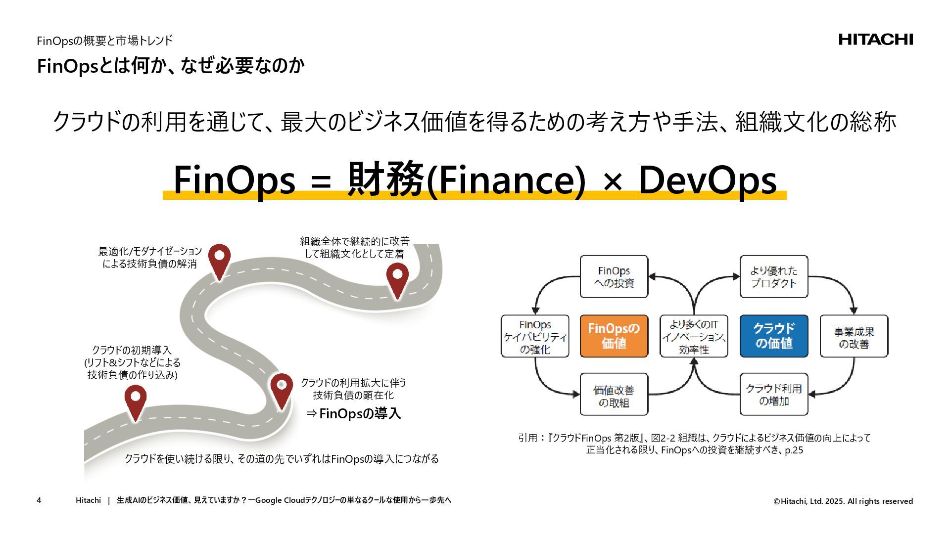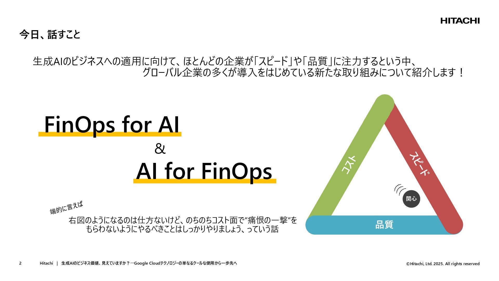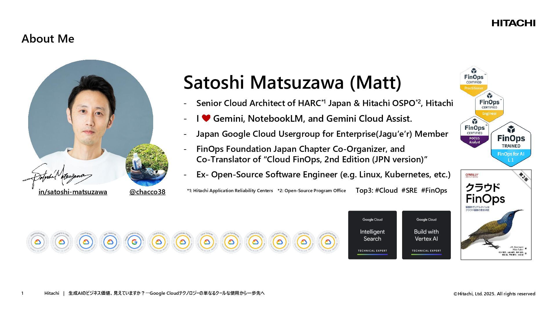 Cloudテクノロジーの単なるクールな使用から一歩先へ About Me Satoshi Matsuzawa (Matt) - Senior Cloud Architect of HARC*1 Japan & Hitachi OSPO*2, Hitachi - I Gemini, NotebookLM, and Gemini Cloud Assist. - Japan Google Cloud Usergroup for Enterprise(Jagu’e’r) Member - FinOps Foundation Japan Chapter Co-Organizer, and Co-Translator of “Cloud FinOps, 2nd Edition (JPN version)” - Ex- Open-Source Software Engineer (e.g. Linux, Kubernetes, etc.) in/satoshi-matsuzawa @chacco38 *1: Hitachi Application Reliability Centers *2: Open-Source Program Office Top3: #Cloud #SRE #FinOps