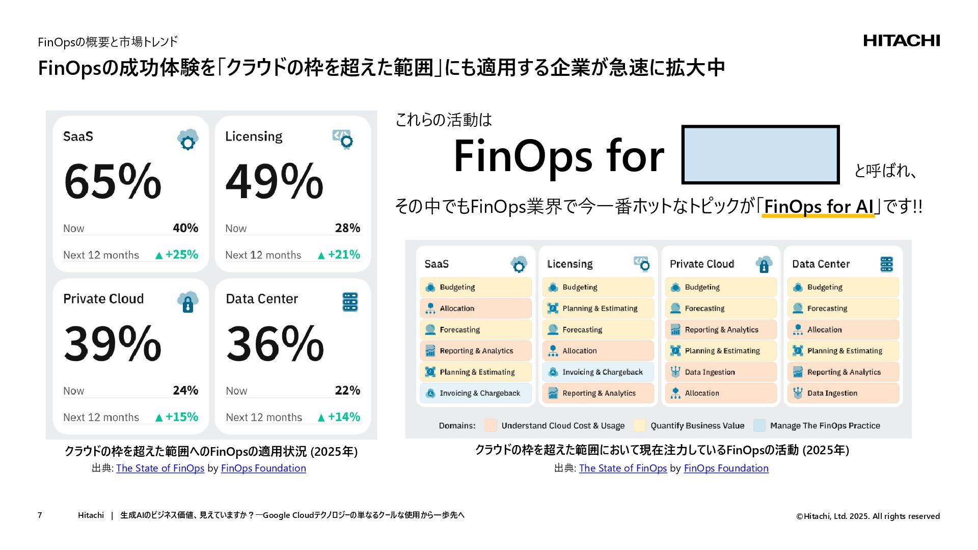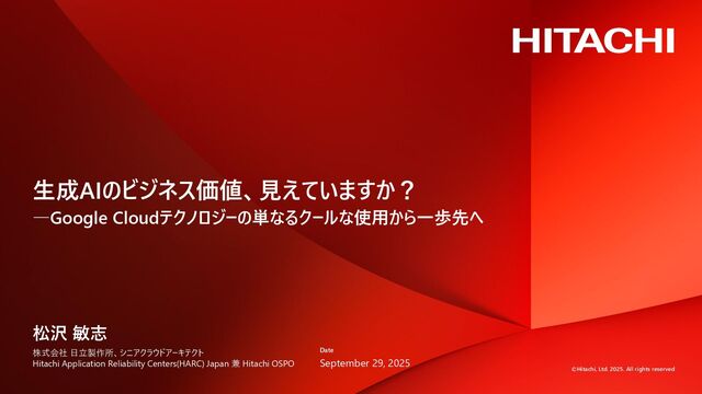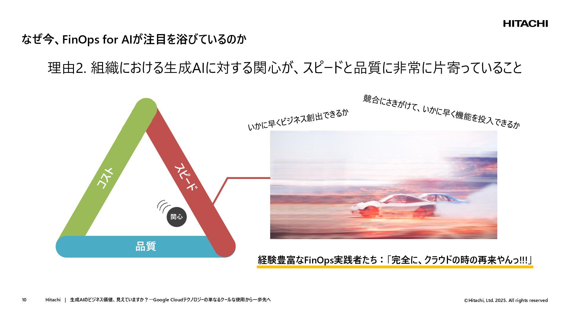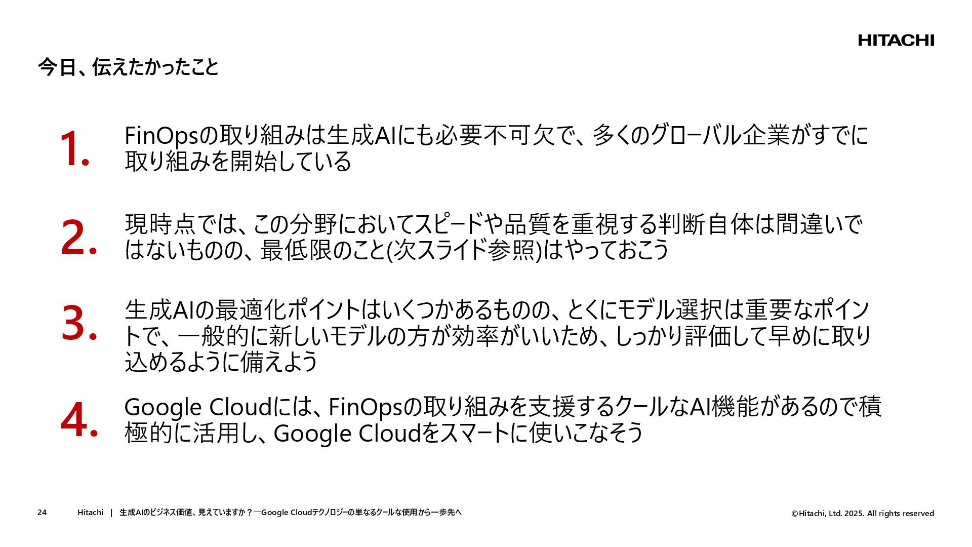 Cloudテクノロジーの単なるクールな使用から一歩先へ About Me Satoshi Matsuzawa (Matt) - Senior Cloud Architect of HARC*1 Japan & Hitachi OSPO*2, Hitachi - I Gemini, NotebookLM, and Gemini Cloud Assist. - Japan Google Cloud Usergroup for Enterprise(Jagu’e’r) Member - FinOps Foundation Japan Chapter Co-Organizer, and Co-Translator of “Cloud FinOps, 2nd Edition (JPN version)” - Ex- Open-Source Software Engineer (e.g. Linux, Kubernetes, etc.) in/satoshi-matsuzawa @chacco38 *1: Hitachi Application Reliability Centers *2: Open-Source Program Office Top3: #Cloud #SRE #FinOps