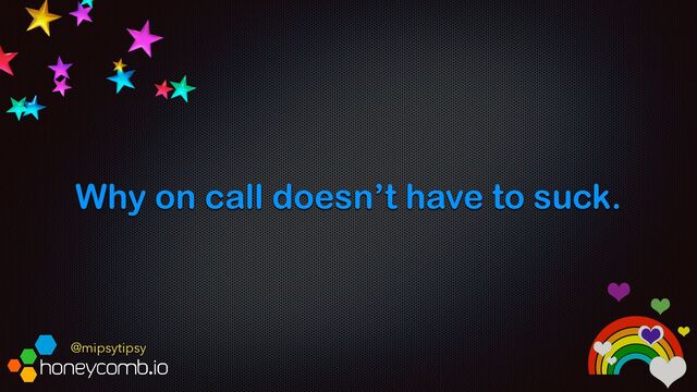 managers. Managers, your job is to make sure owning it doesn’t suck. ⭐ By ensuring you get enough time as a team to fix that which is broken ⭐ Making sure that people are taking time off to compensate for time on call ⭐ By tracking the frequency of out-of-hours alerting ⭐ By creating a training process ⭐ Engineers, your job is to own your code. ⭐ You write it, you run it ⭐ If you work on a highly available service, you should expect to support it ⭐ It’s important for you to close the loop by watching your code in prod ⭐ Systems are getting increasingly complex, to the point that no one *can* be on call for software they don’t write & own ⭐ This is the way to cleaner systems ⭐ SOMEONE’s gotta do it ⭐