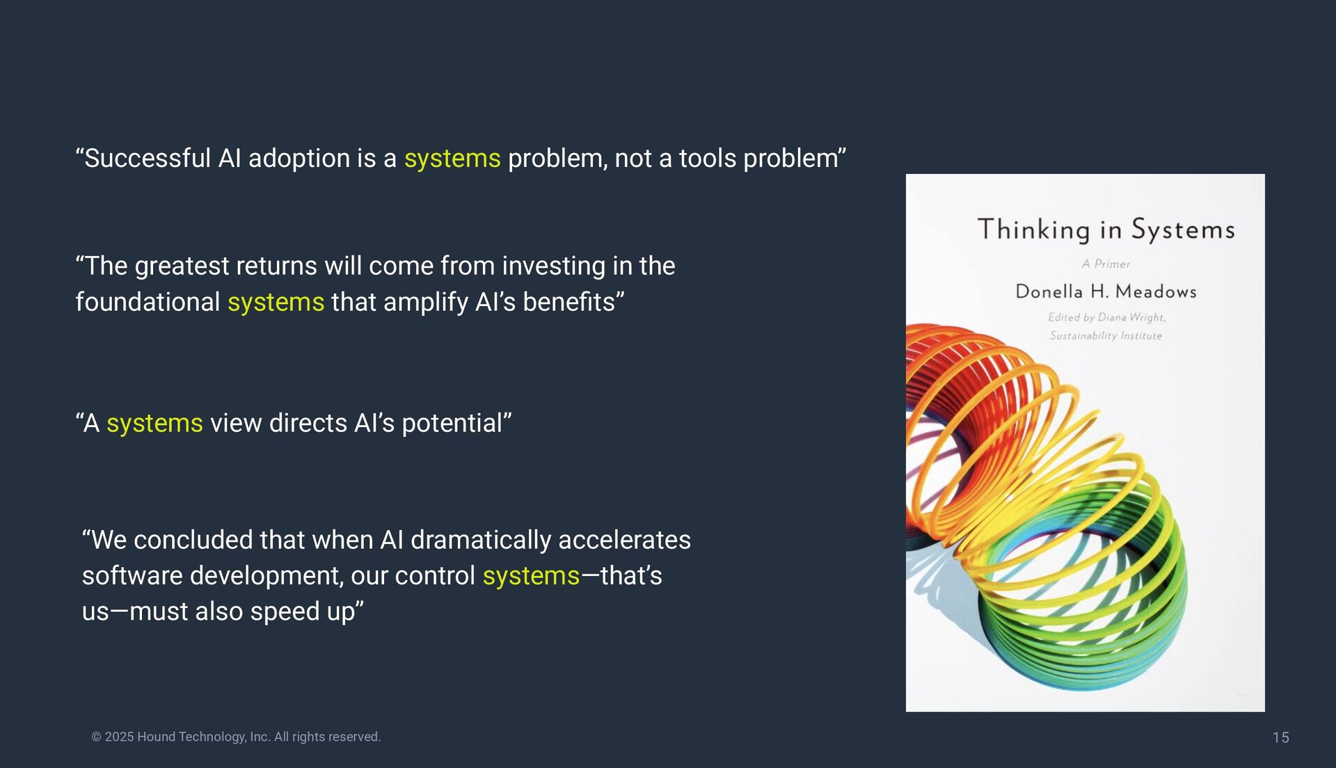 systems view directs AI’s potential” “The greatest returns will come from investing in the foundational systems that amplify AI’s benefits” “Successful AI adoption is a systems problem, not a tools problem” “We concluded that when AI dramatically accelerates software development, our control systems—that’s us—must also speed up”