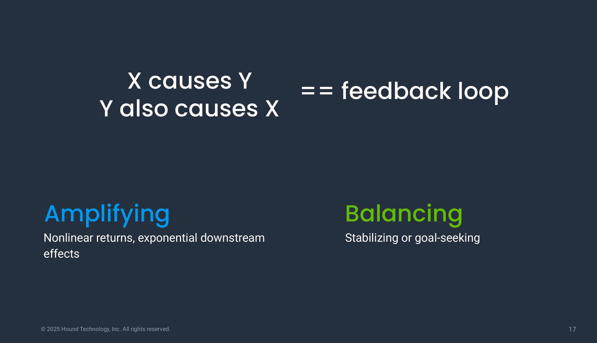 causes Y Y also causes X == feedback loop Amplifying Balancing Nonlinear returns, exponential downstream effects Stabilizing or goal-seeking