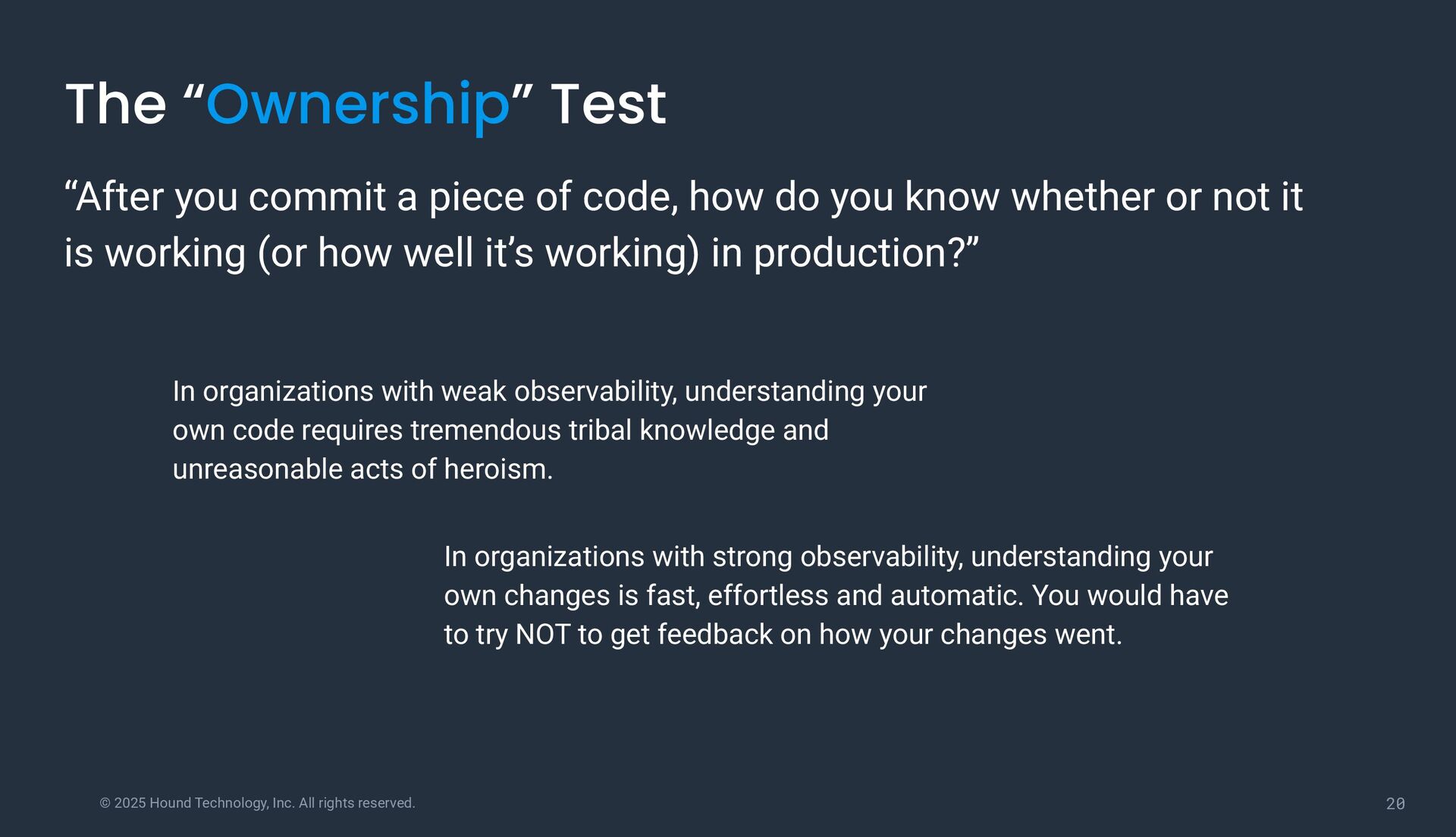 “Ownership” Test “After you commit a piece of code, how do you know whether or not it is working (or how well it’s working) in production?” In organizations with weak observability, understanding your own code requires tremendous tribal knowledge and unreasonable acts of heroism. In organizations with strong observability, understanding your own changes is fast, effortless and automatic. You would have to try NOT to get feedback on how your changes went.