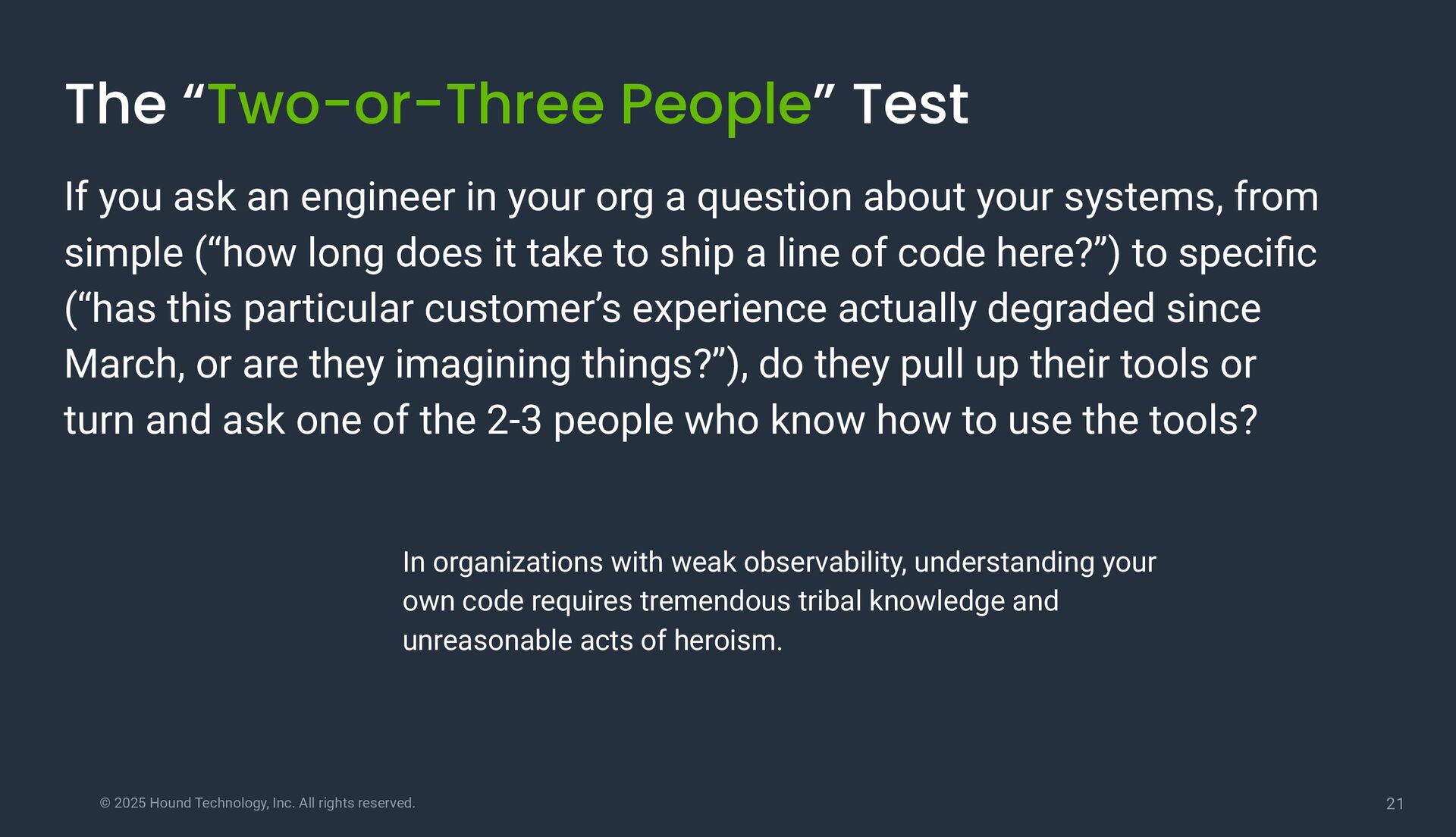 “Two-or-Three People” Test If you ask an engineer in your org a question about your systems, from simple (“how long does it take to ship a line of code here?”) to specific (“has this particular customer’s experience actually degraded since March, or are they imagining things?”), do they pull up their tools or turn and ask one of the 2-3 people who know how to use the tools? In organizations with weak observability, understanding your own code requires tremendous tribal knowledge and unreasonable acts of heroism.