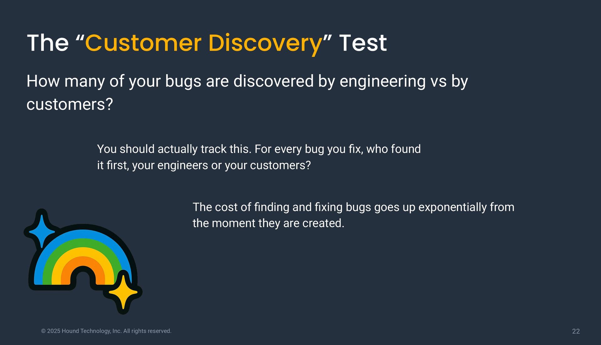 “Customer Discovery” Test How many of your bugs are discovered by engineering vs by customers? You should actually track this. For every bug you fix, who found it first, your engineers or your customers? The cost of finding and fixing bugs goes up exponentially from the moment they are created.
