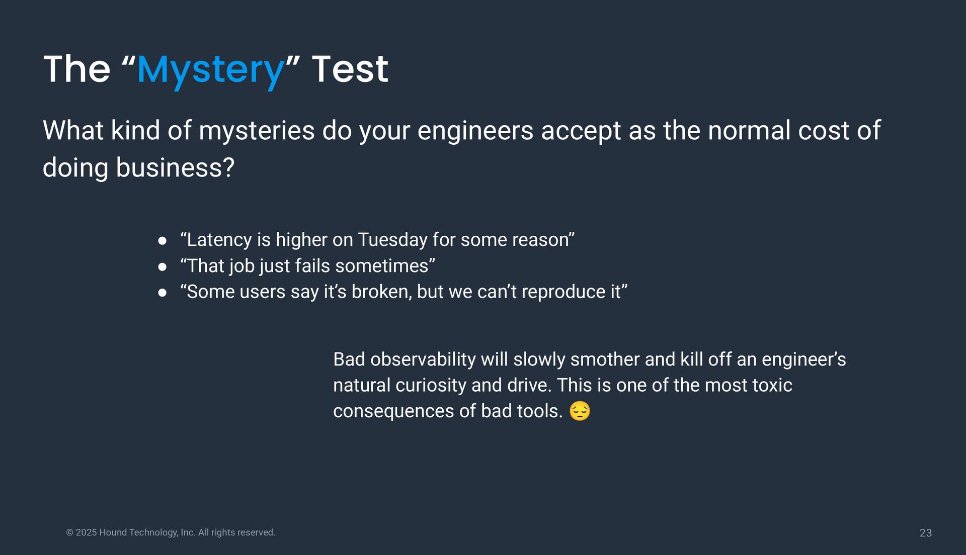 “Mystery” Test What kind of mysteries do your engineers accept as the normal cost of doing business? • “Latency is higher on Tuesday for some reason” • “That job just fails sometimes” • “Some users say it’s broken, but we can’t reproduce it” Bad observability will slowly smother and kill off an engineer’s natural curiosity and drive. This is one of the most toxic consequences of bad tools. 😔