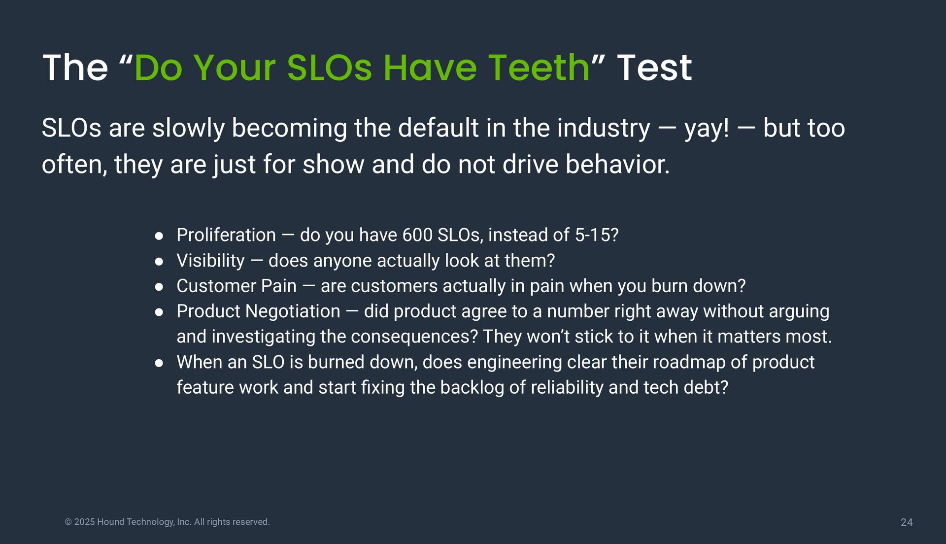 “Do Your SLOs Have Teeth” Test SLOs are slowly becoming the default in the industry — yay! — but too often, they are just for show and do not drive behavior. • Proliferation — do you have 600 SLOs, instead of 5-15? • Visibility — does anyone actually look at them? • Customer Pain — are customers actually in pain when you burn down? • Product Negotiation — did product agree to a number right away without arguing and investigating the consequences? They won’t stick to it when it matters most. • When an SLO is burned down, does engineering clear their roadmap of product feature work and start fixing the backlog of reliability and tech debt?