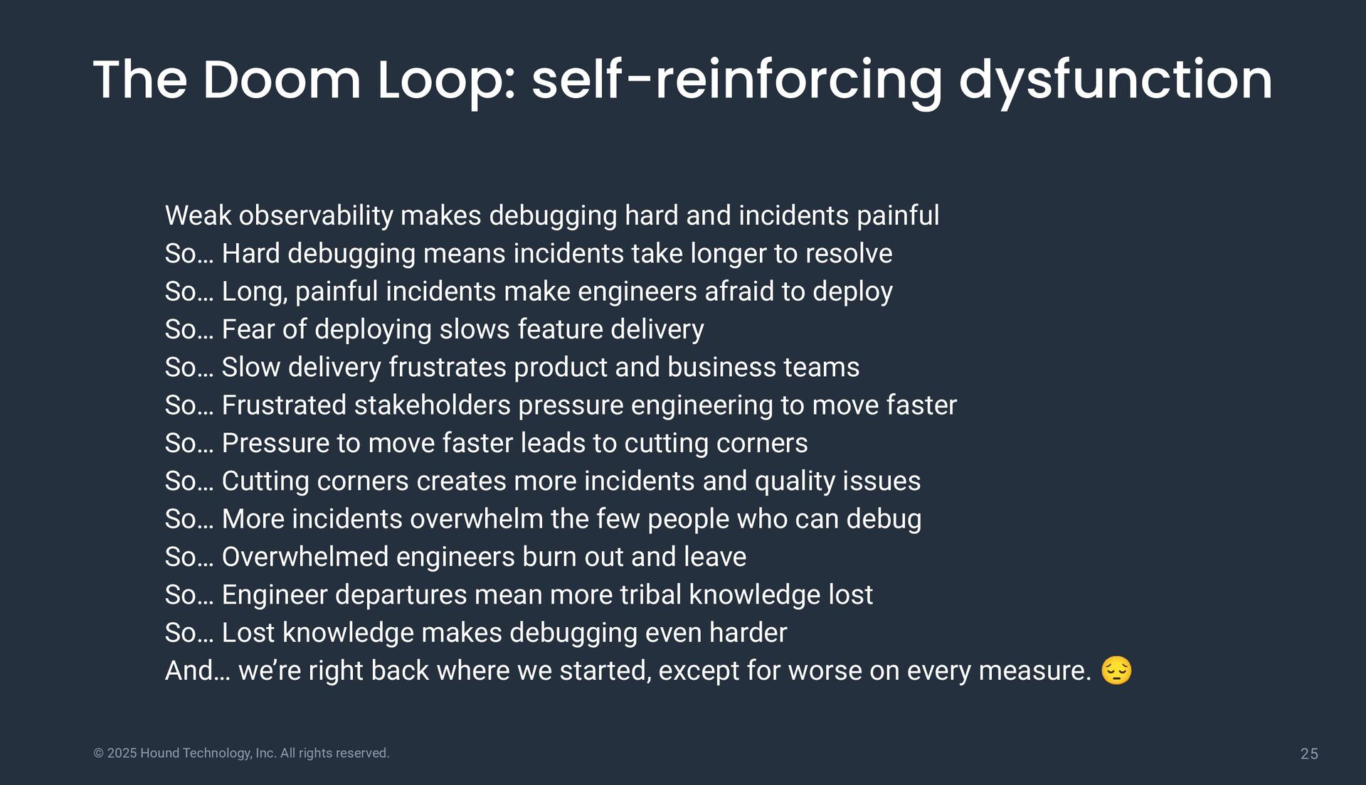 Doom Loop: self-reinforcing dysfunction Weak observability makes debugging hard and incidents painful So… Hard debugging means incidents take longer to resolve So… Long, painful incidents make engineers afraid to deploy So… Fear of deploying slows feature delivery So… Slow delivery frustrates product and business teams So… Frustrated stakeholders pressure engineering to move faster So… Pressure to move faster leads to cutting corners So… Cutting corners creates more incidents and quality issues So… More incidents overwhelm the few people who can debug So… Overwhelmed engineers burn out and leave So… Engineer departures mean more tribal knowledge lost So… Lost knowledge makes debugging even harder And… we’re right back where we started, except for worse on every measure. 😔