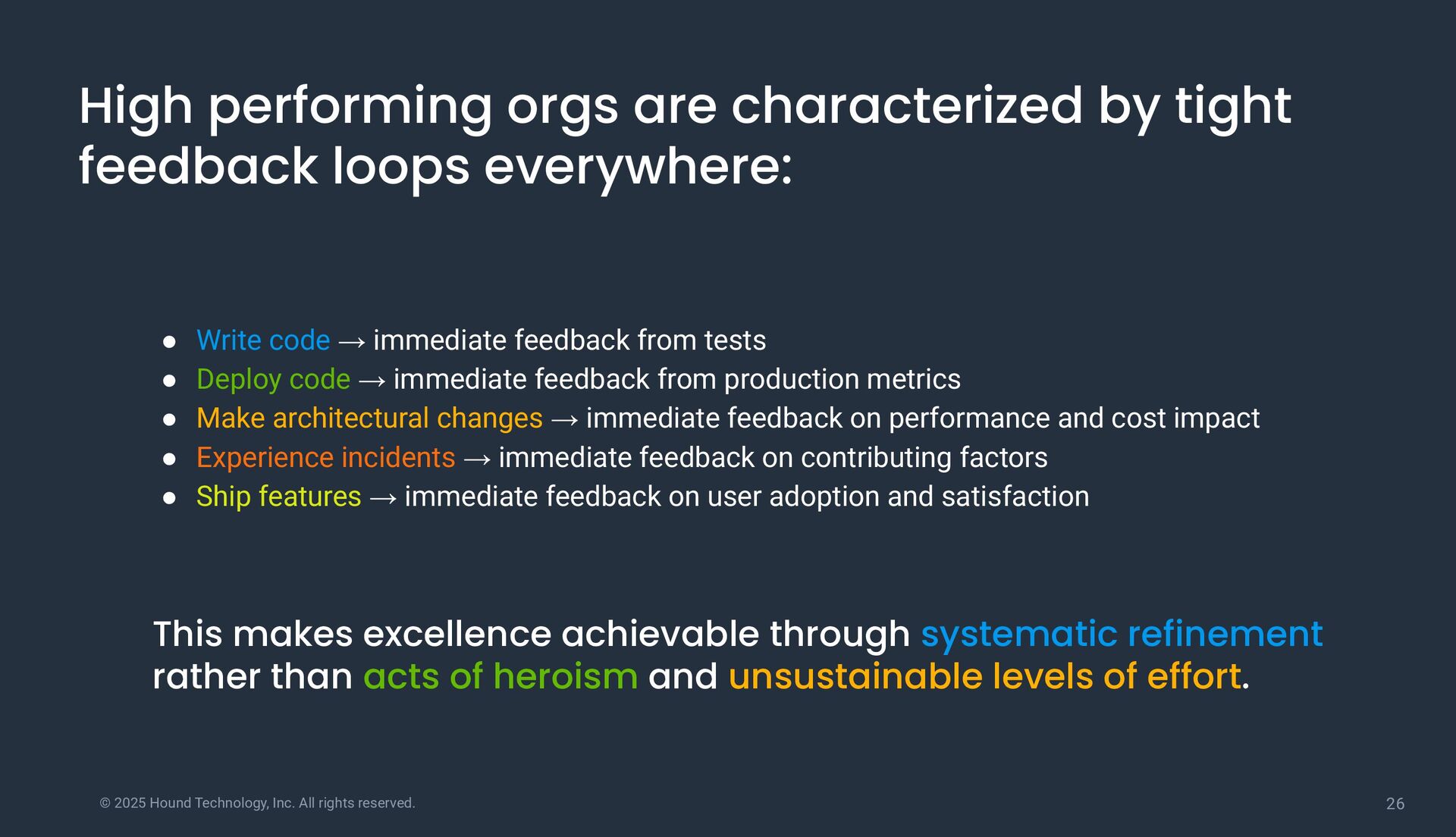 Write code → immediate feedback from tests • Deploy code → immediate feedback from production metrics • Make architectural changes → immediate feedback on performance and cost impact • Experience incidents → immediate feedback on contributing factors • Ship features → immediate feedback on user adoption and satisfaction High performing orgs are characterized by tight feedback loops everywhere: This makes excellence achievable through systematic refinement rather than acts of heroism and unsustainable levels of effort.
