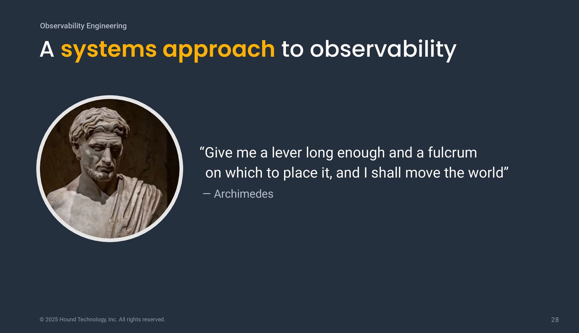 systems approach to observability “Give me a lever long enough and a fulcrum on which to place it, and I shall move the world” — Archimedes Observability Engineering