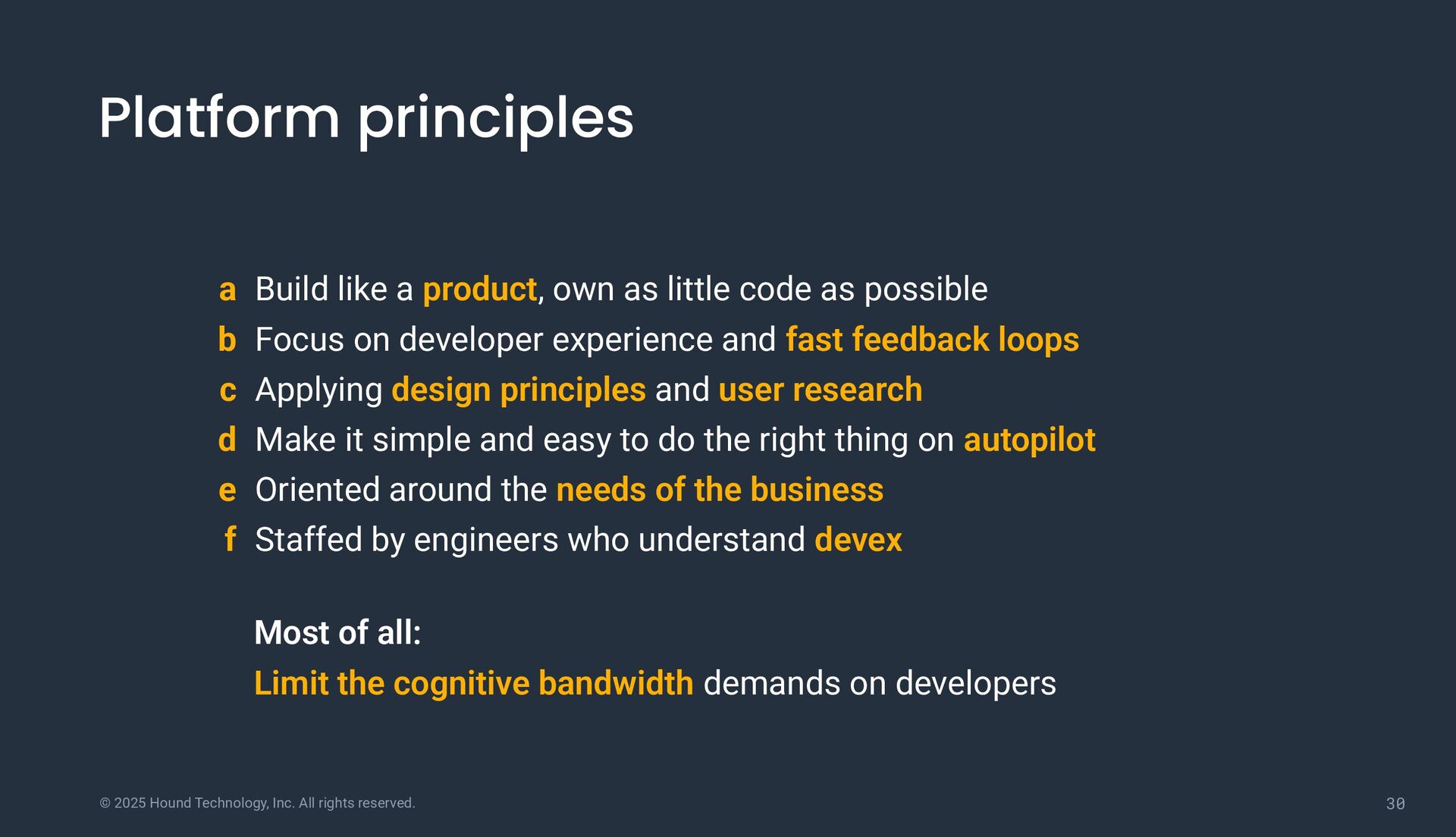 principles a Build like a product, own as little code as possible b Focus on developer experience and fast feedback loops c Applying design principles and user research d Make it simple and easy to do the right thing on autopilot e Oriented around the needs of the business f Staffed by engineers who understand devex Most of all: Limit the cognitive bandwidth demands on developers