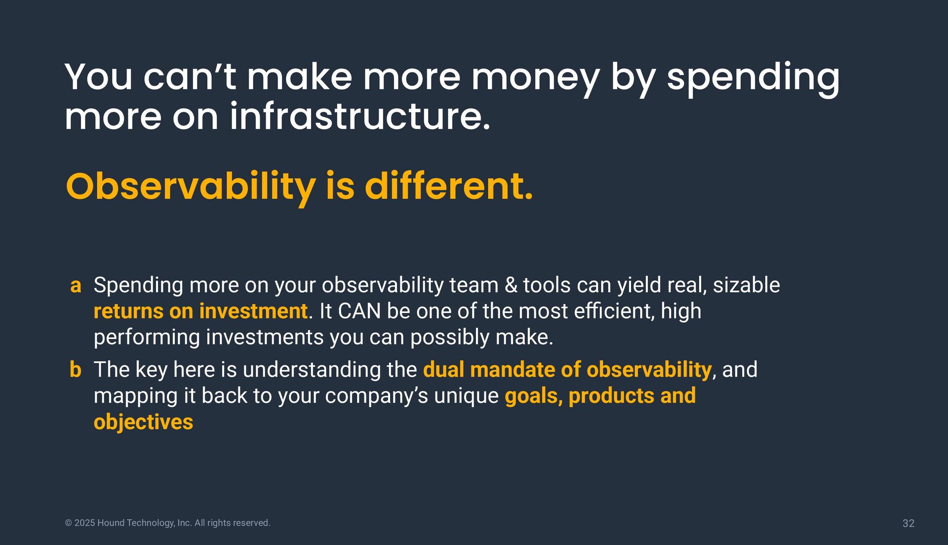 can’t make more money by spending more on infrastructure. Observability is different. a Spending more on your observability team & tools can yield real, sizable returns on investment. It CAN be one of the most efficient, high performing investments you can possibly make. b The key here is understanding the dual mandate of observability, and mapping it back to your company’s unique goals, products and objectives